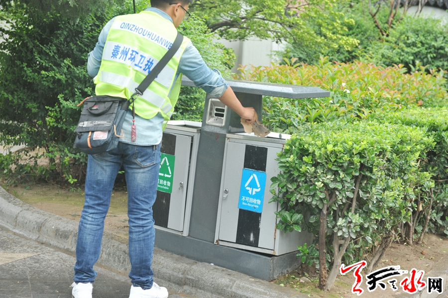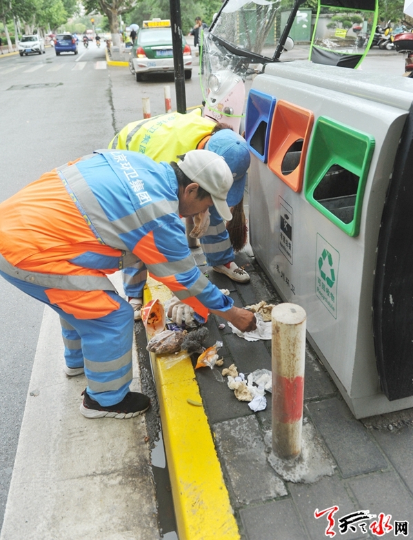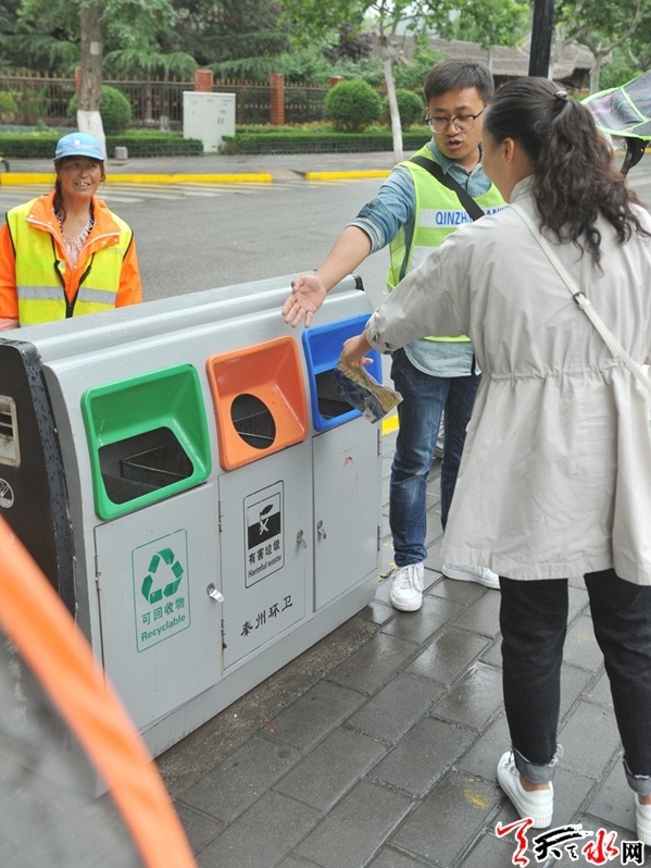 “师傅,您好!我把餐厨垃圾倒到垃圾桶里了,把装垃圾的塑料袋和可回收垃圾放在了垃圾桶的旁边,过会儿收垃圾的师傅来了麻烦您给说一下。”6月25日,秦州区东桥头一小区的住户在扔垃圾时向小区的环卫师傅说道:“能不能给小区物业部门建议一下,多增加一个可回收垃圾投放桶。”