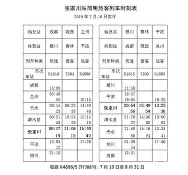 2、临客K4896次兰州-平凉,兰州10:15开,沿途经停定西、陇西、甘谷、天水、清水县、张家川、安口窑站,17:29到平凉。自7月10起,临客K4896次张家川站到开点为:12:33到,12:36开。