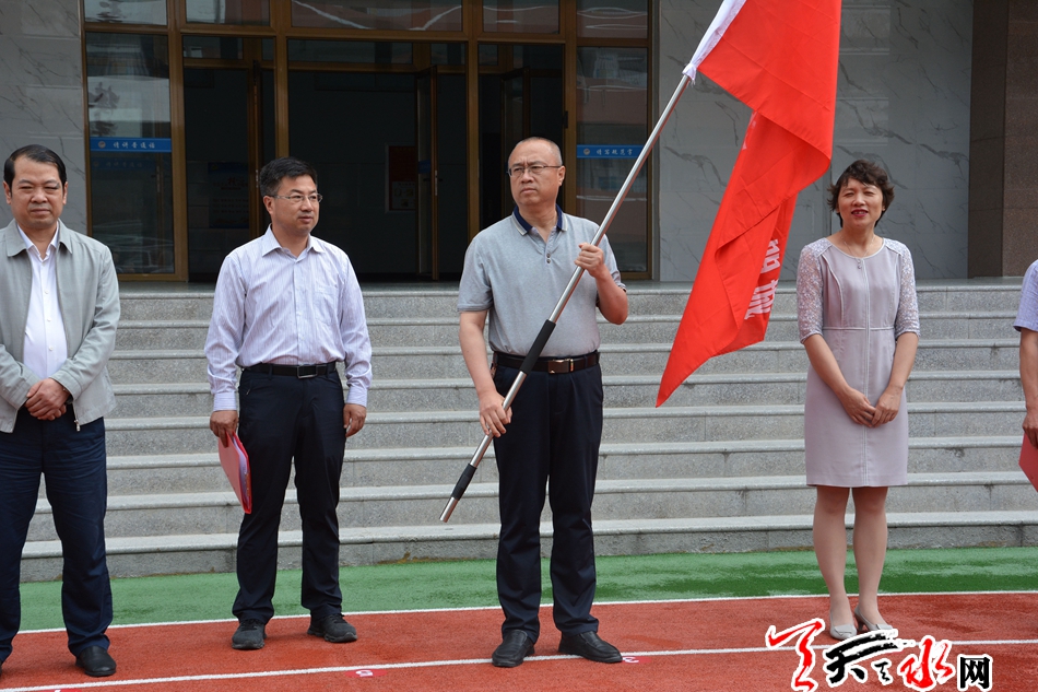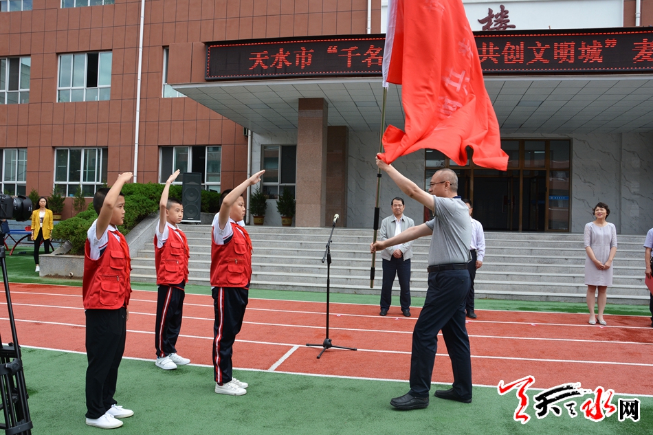 (天水日报社总编辑丰艺明为小记者授旗)