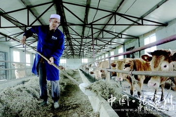 米世贵是上磨村村民,以前在家里养了十几年牛,在担任合作社饲养员之前他还经常到县里去学习养牛技术,这项工作对他来说已是驾轻就熟。“喂牛要勤快,饲料要按照少喂勤添,先粗后精的原则,牛吃足了草料,自由饮水,有条件可解开绳,让牛自由活动一到三个小时,每天多晒晒太阳。”米世贵说,以前在自家就养一两头牛,不成规模,经济效益并不高,但一天还是忙得团团转。如今在合作社找到了工作,当上了饲养员,除了年底分红外,每月还可以领到3000元的工资。
