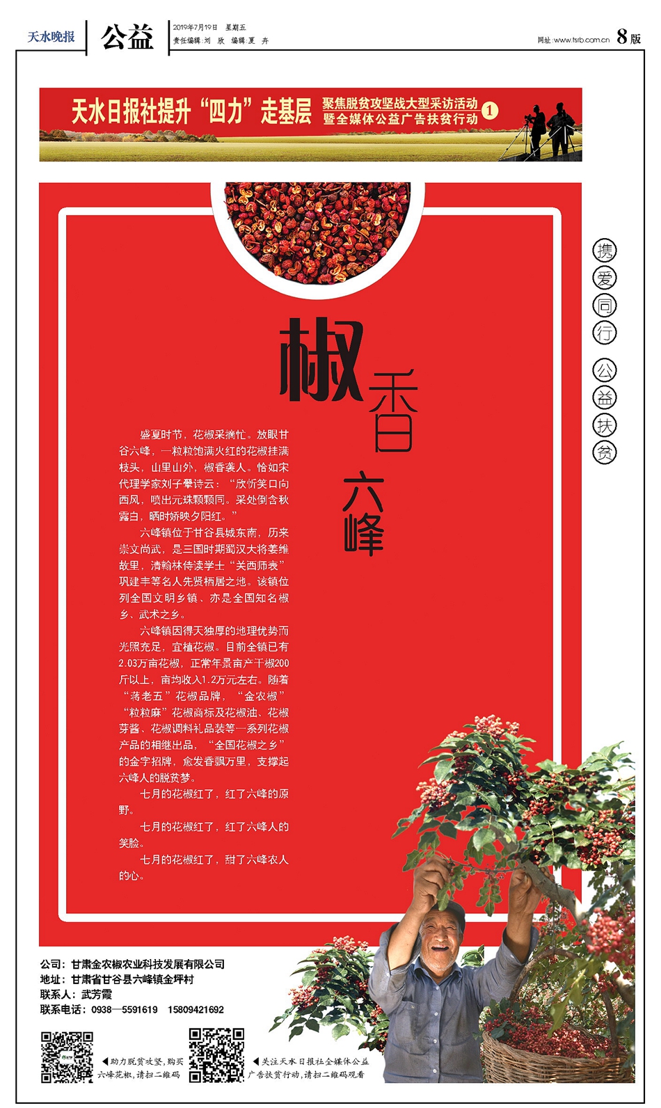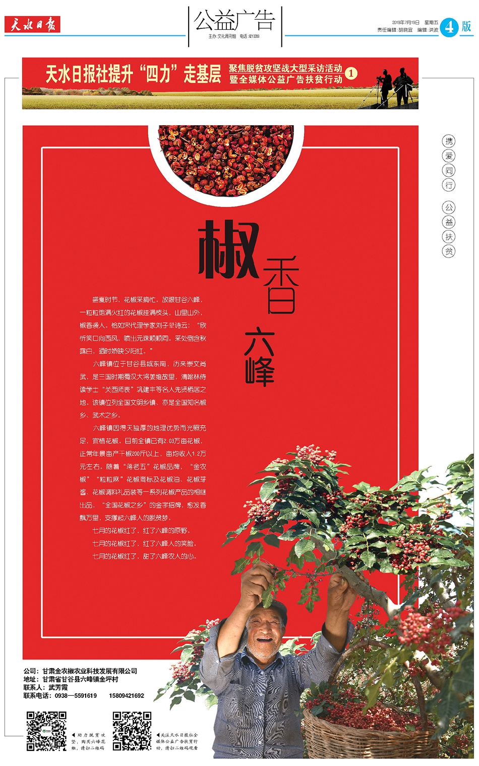 从今日开始,天水日报社全媒体公益广告扶贫行动正式启动,将用一年半时间,在《天水日报》《天水晚报》分阶段推出100个“助力脱贫攻坚全媒体公益广告”专版。天天天水网、天水日报公众号、天水发布等各网络媒体平台还将推出“扶贫公益广告”专题、宣传片,通过图文报道、H5产品、短视频等新媒体产品,创新传播形式,强化传播效果,扩大传播覆盖面。第一期走进甘谷县六峰镇,关注六峰镇花椒产业,推荐六峰镇花椒产品。
