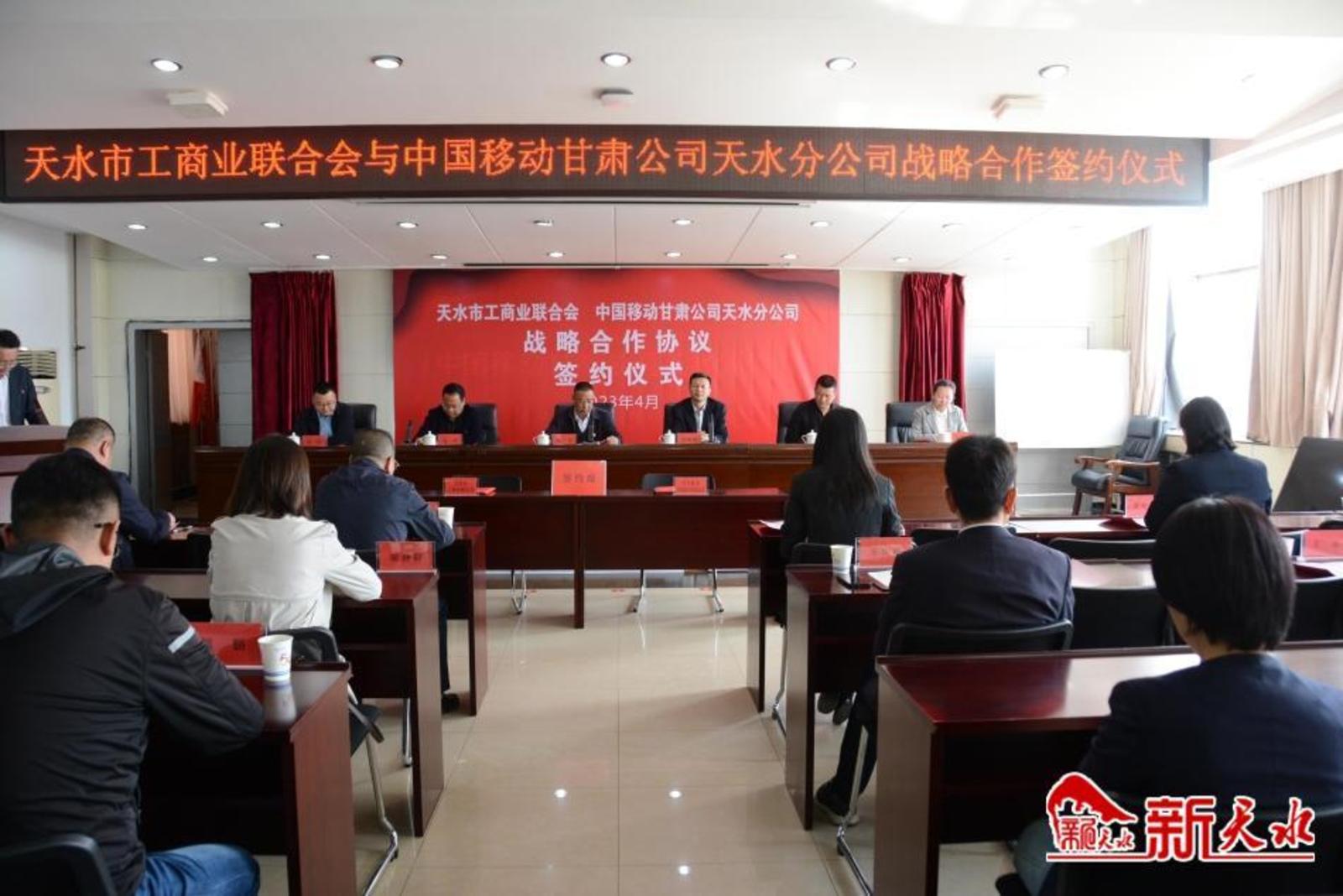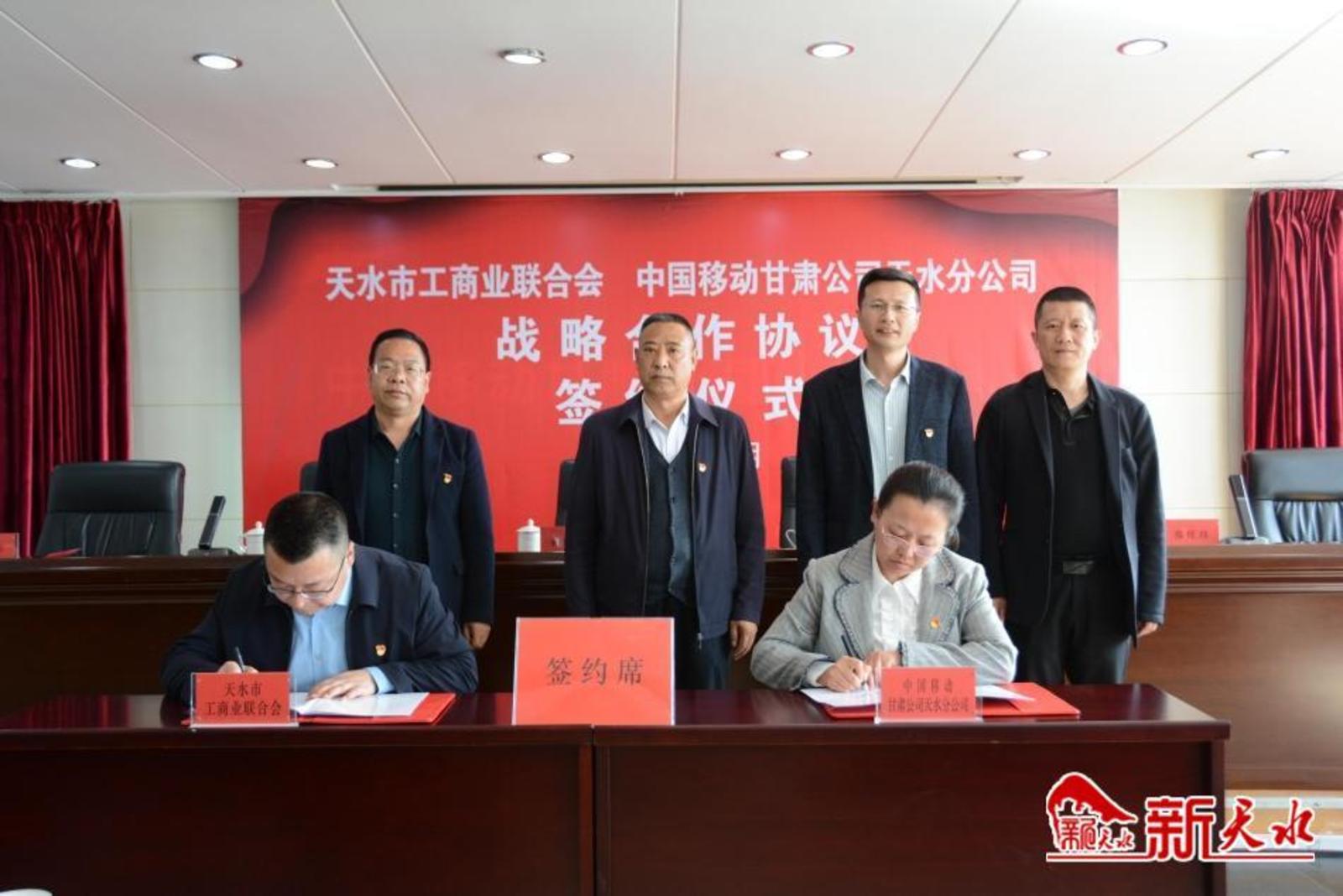 新天水讯【记者 黄虹】4月14日下午,天水市工商业联合会与中国移动通信集团甘肃有限公司天水分公司签订战略合作协议。天水市工商业联合会党组书记、常务副主席韩广文与天水移动公司党委书记、总经理冯晓风分别致辞。天水市工商业联合会党组成员、副主席李怡和天水移动公司党委委员、副总经理刘晓萍代表双方签约。