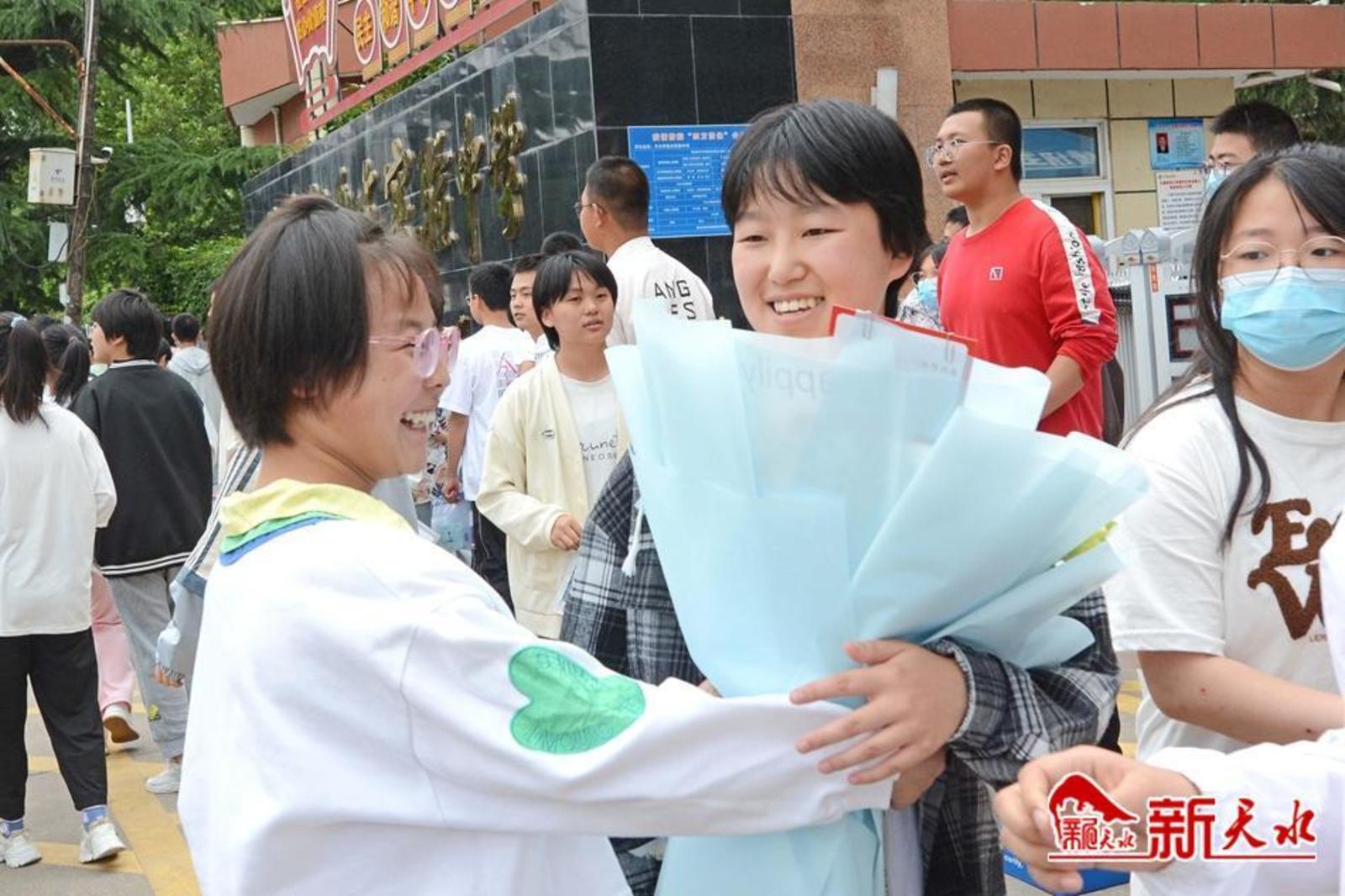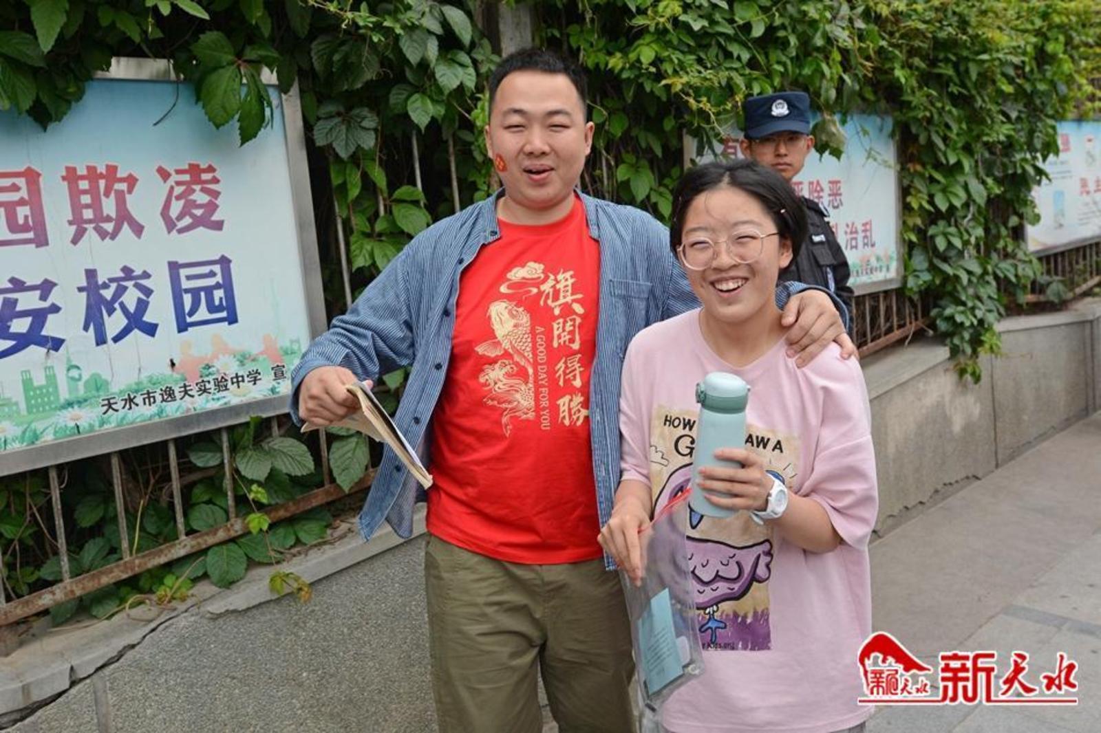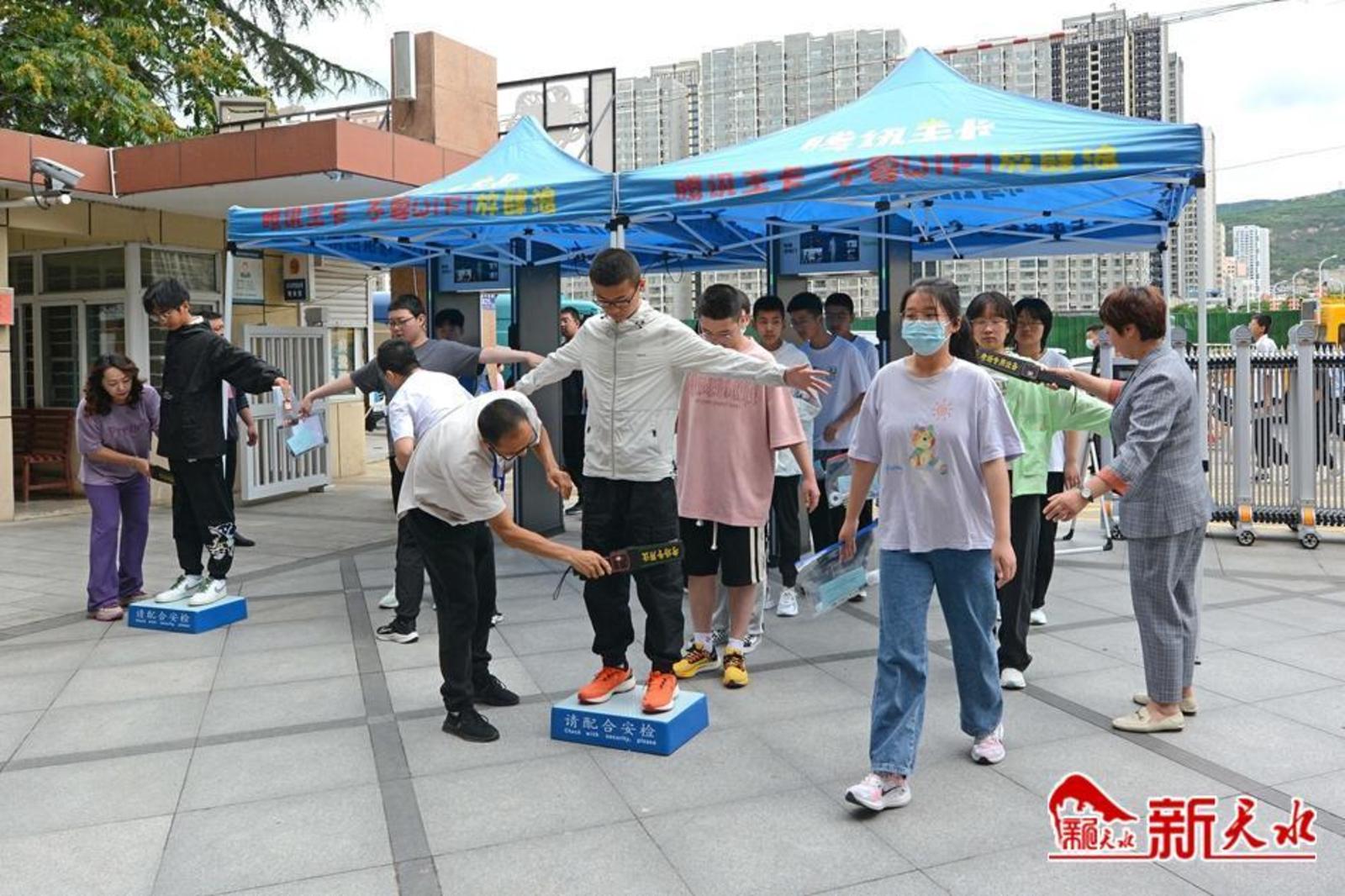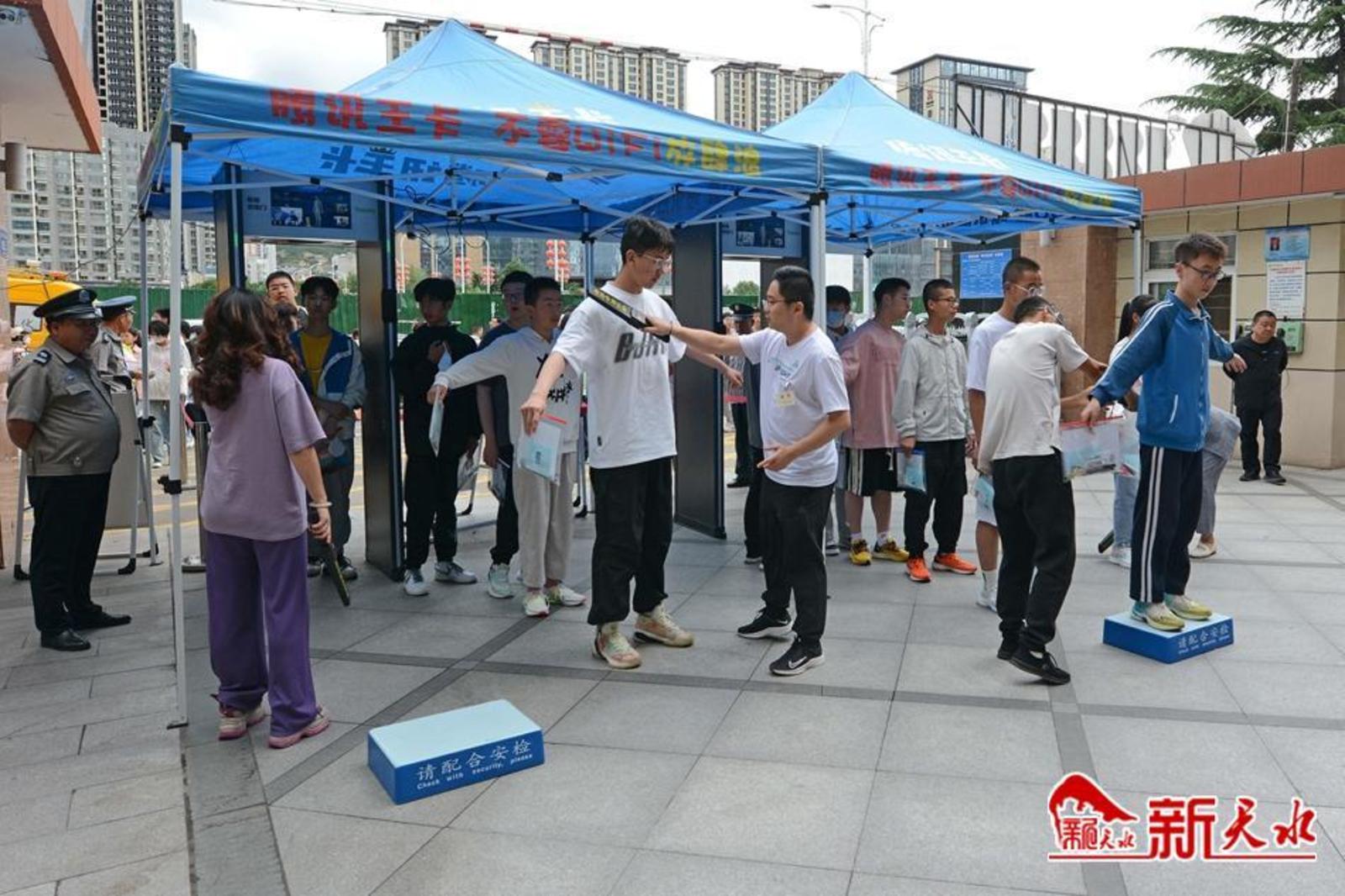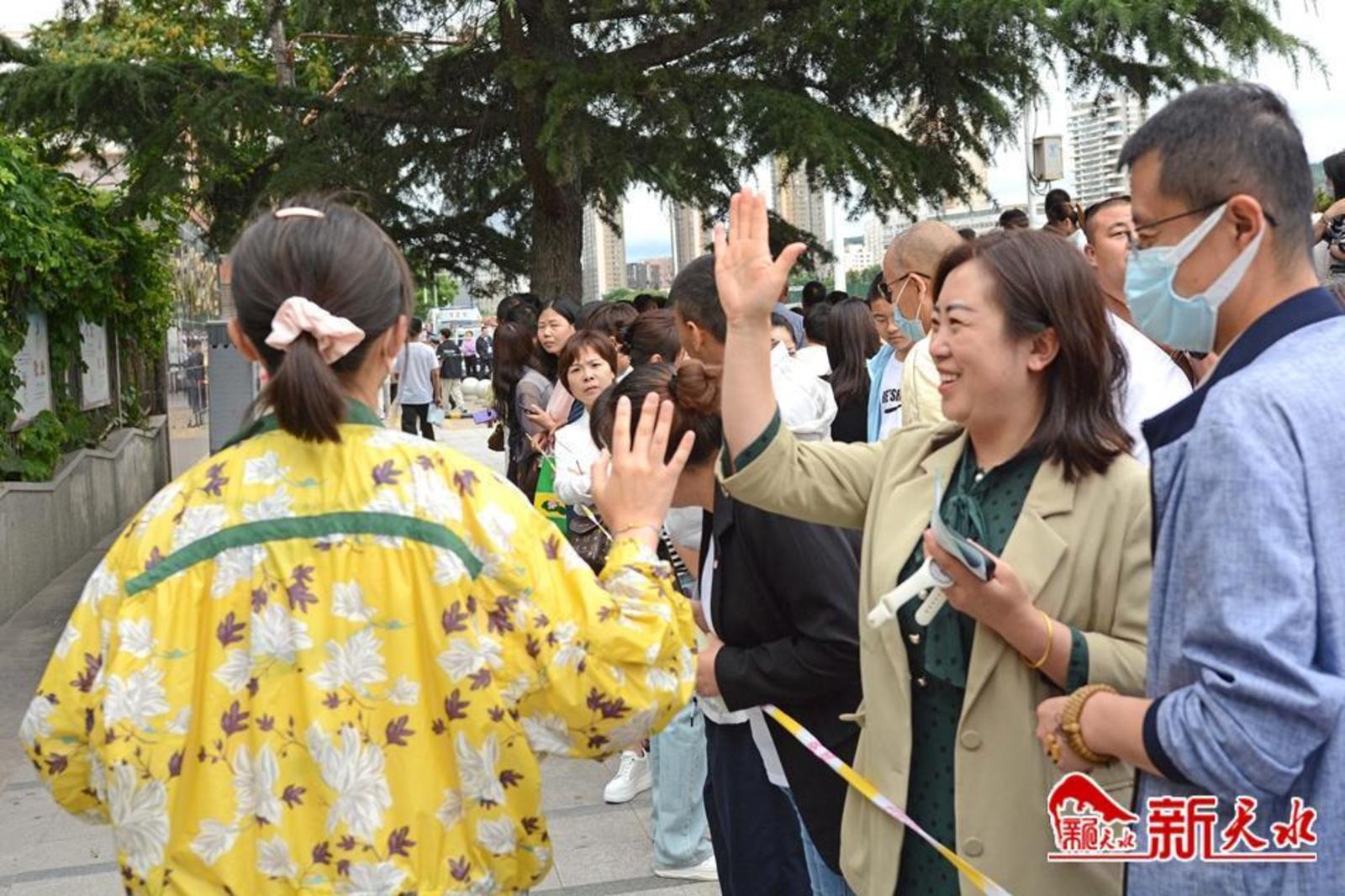 在天水市逸夫中学考点,考生有序通过安检进入考场。家长们在外目送孩子走进考点。一位父亲身穿“旗开得胜”字样的圆领衫,祝愿女儿考试顺利;一位母亲与女儿击掌挥手,加油鼓劲;考生向家长竖起“胜利”手势,胸有成竹地走进考场;公安干警维持考点外秩序,帮助行动不便的考生进入考场。第一科考试结束,家长们翘首张望孩子走出考点,弟弟妹妹手捧鲜花迎接哥哥和姐姐……