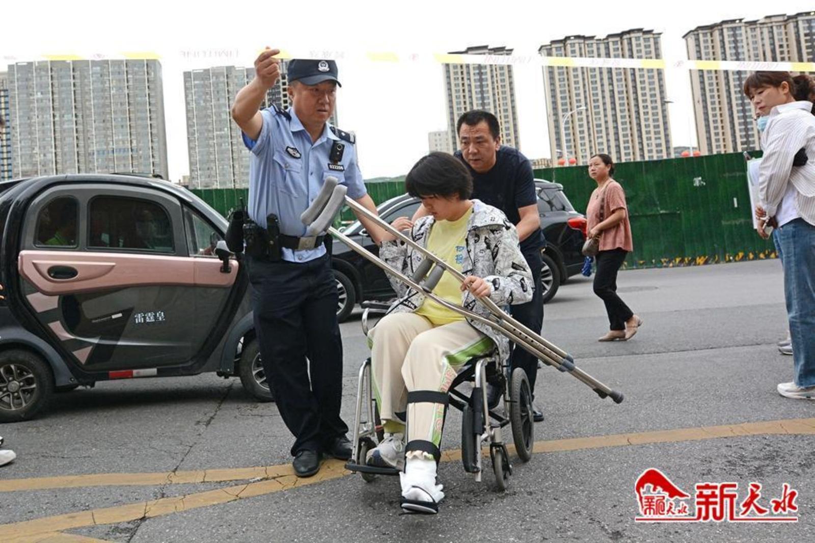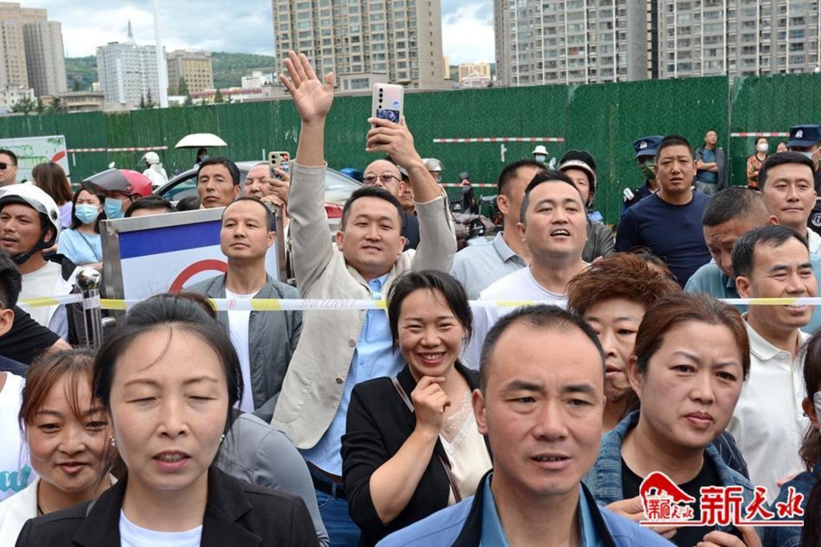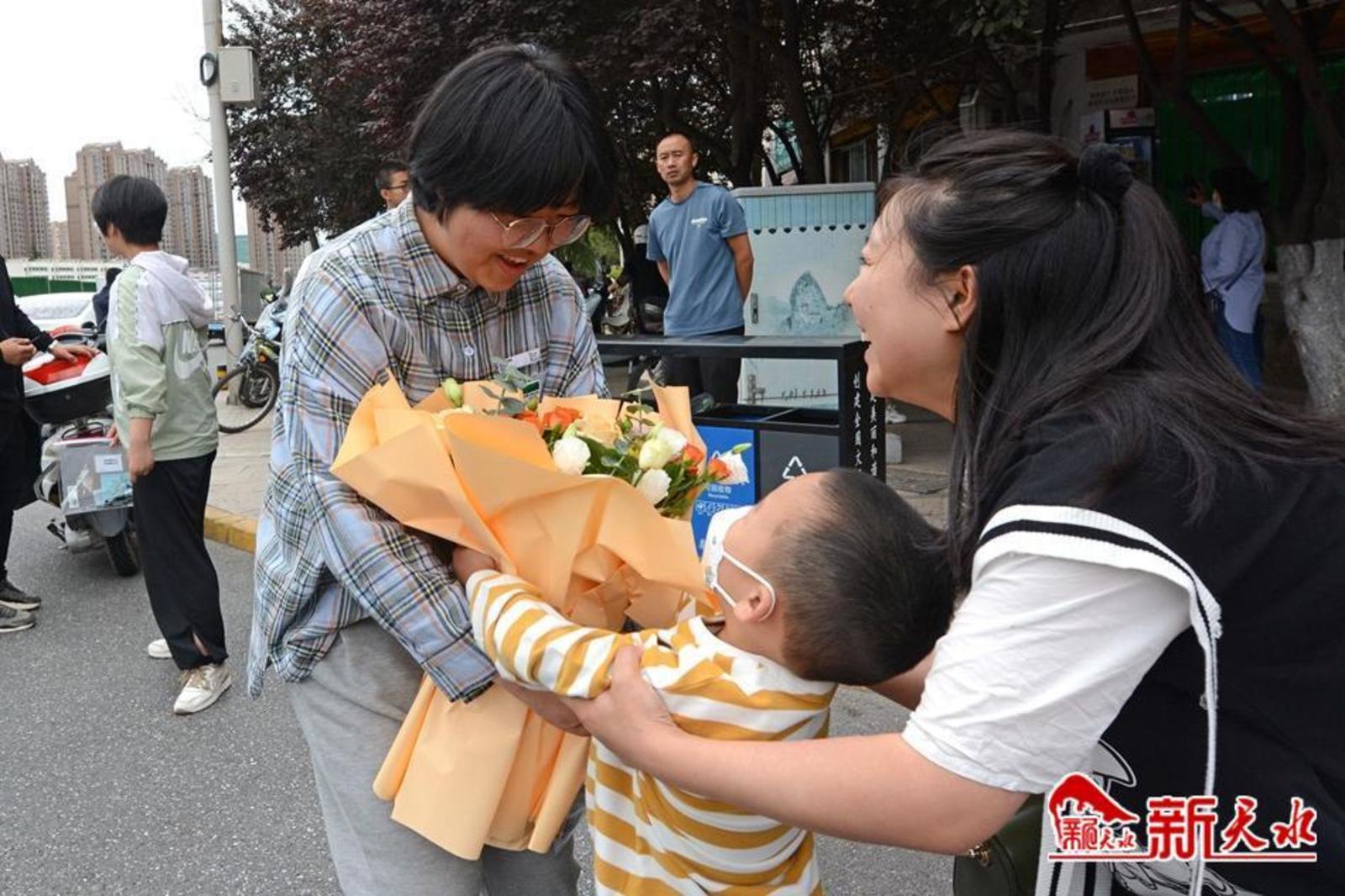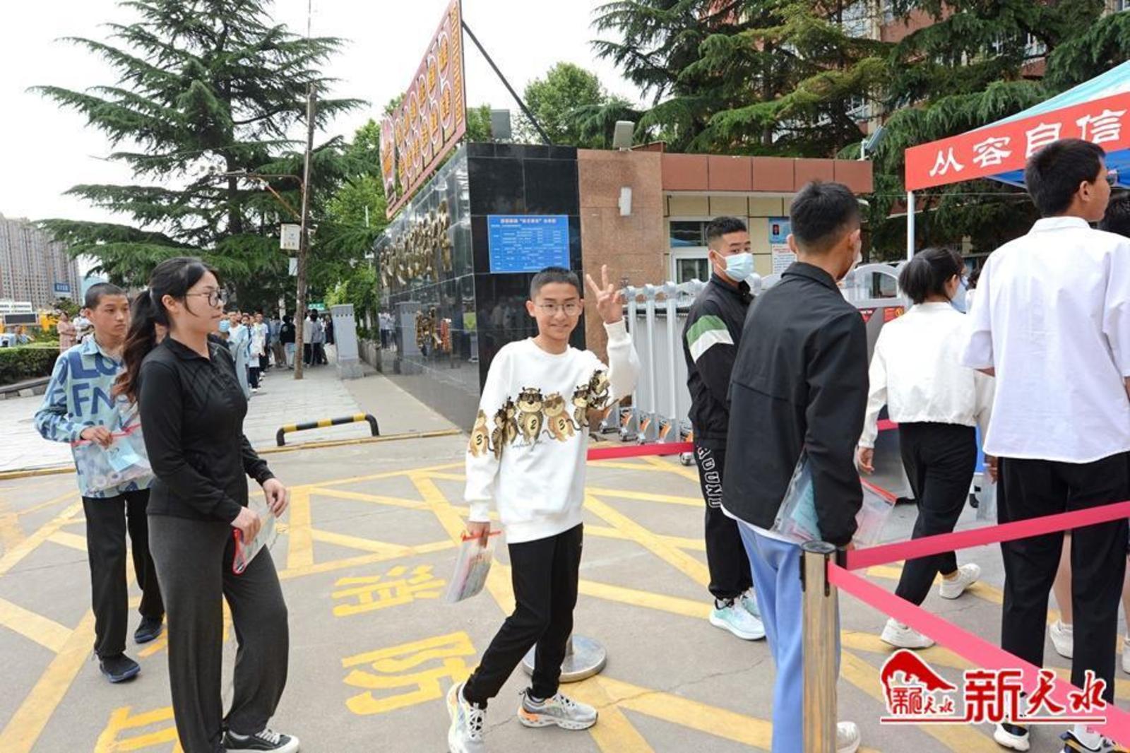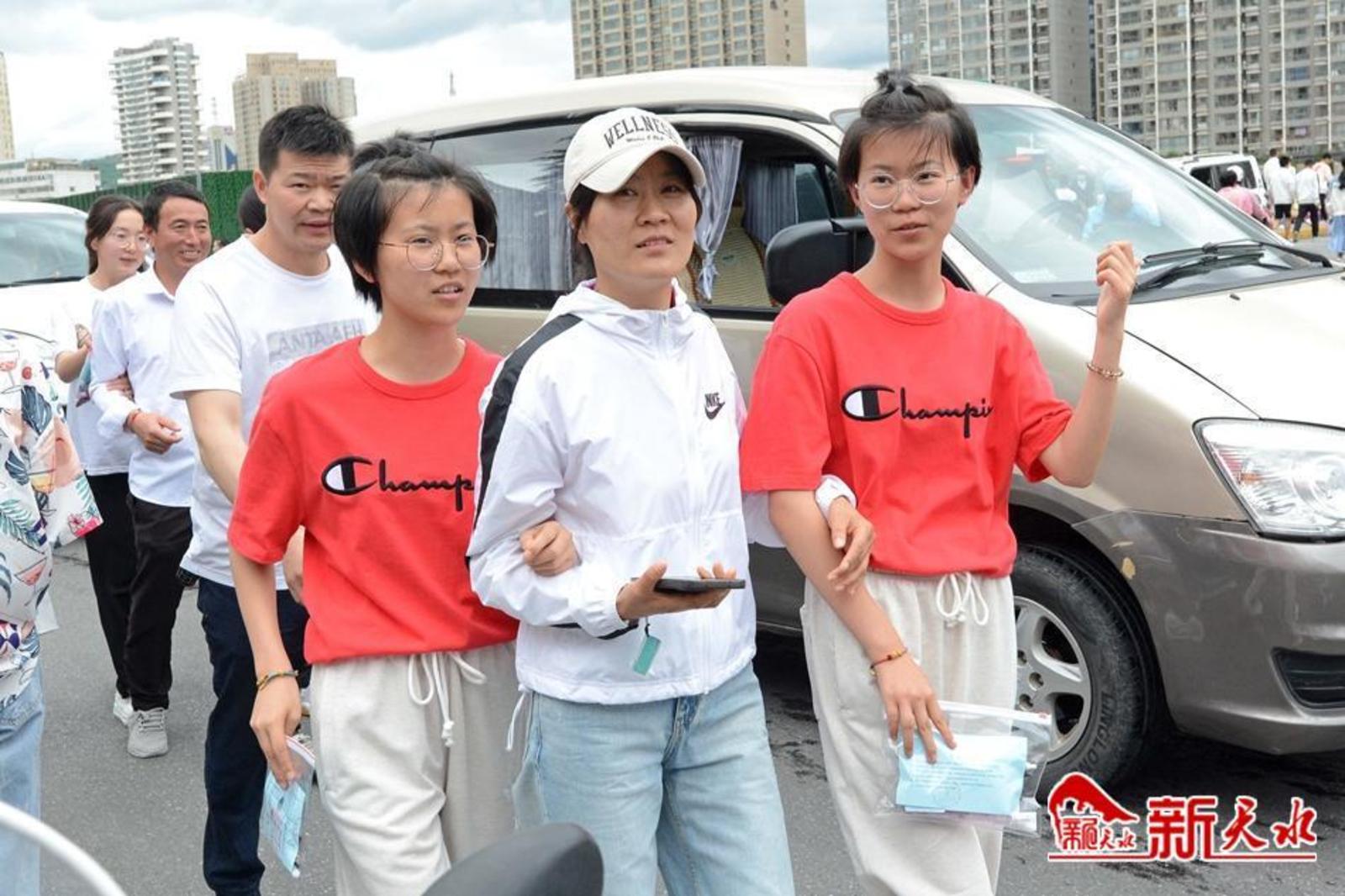 在天水市逸夫中学考点,考生有序通过安检进入考场。家长们在外目送孩子走进考点。一位父亲身穿“旗开得胜”字样的圆领衫,祝愿女儿考试顺利;一位母亲与女儿击掌挥手,加油鼓劲;考生向家长竖起“胜利”手势,胸有成竹地走进考场;公安干警维持考点外秩序,帮助行动不便的考生进入考场。第一科考试结束,家长们翘首张望孩子走出考点,弟弟妹妹手捧鲜花迎接哥哥和姐姐……