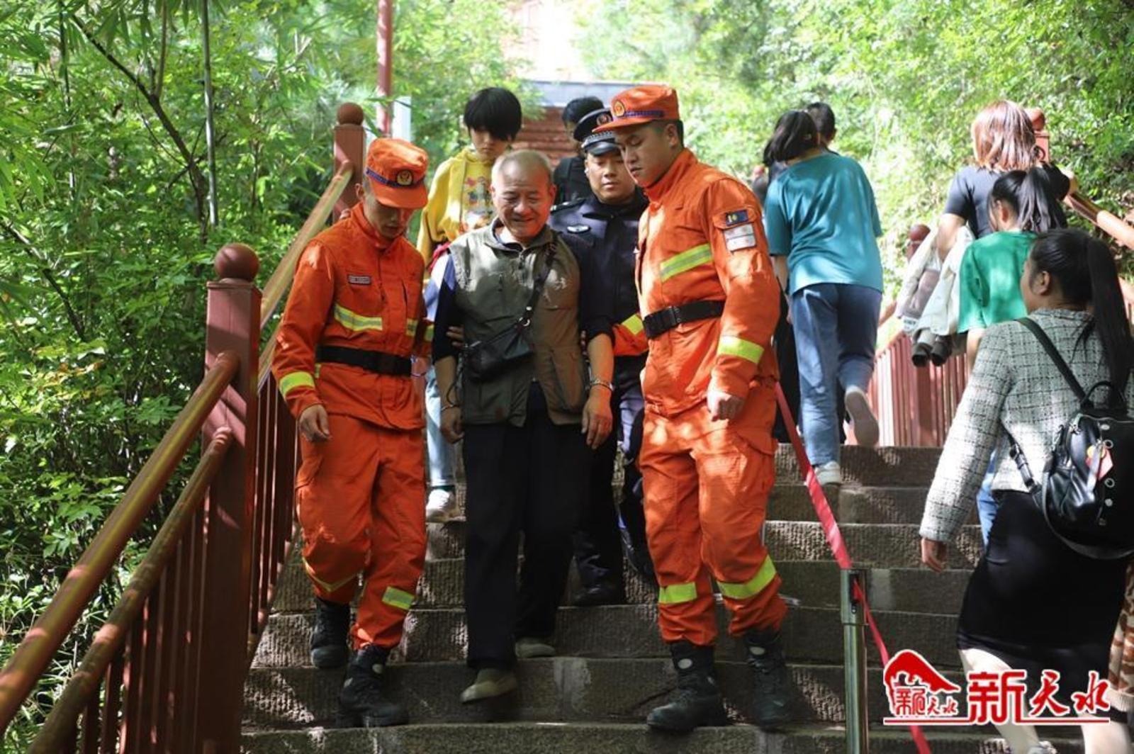 新天水讯【记者王晓华】“大妈,您慢点上,这个台阶比较陡。”10月6日上午,在麦积山石窟游览区,身着鲜亮橙色消防服的队员正在搀扶一位老人上木梯。放眼望去,这些橙色星星点点遍布在景区周边,就像景区一道亮丽的风景。