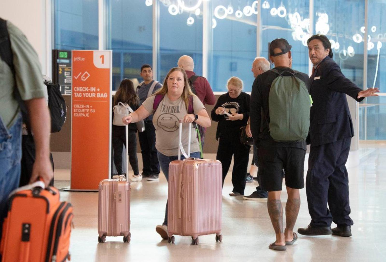 5月26日,旅客在美国加州旧金山国际机场办理登机手续。新华社发(李建国摄)