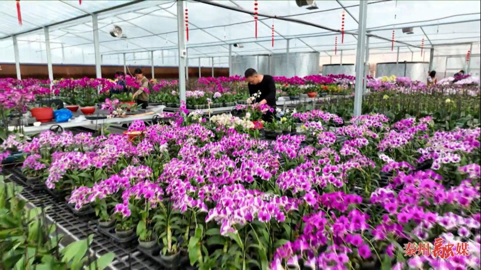 正值隆冬,室外天气寒冷,但兰花产业园基地大棚里却暖意融融、生机盎然,花架上造型各异的兰花竞相绽放。工人们正在开展组花、喷洒农药、除草等管理作业。