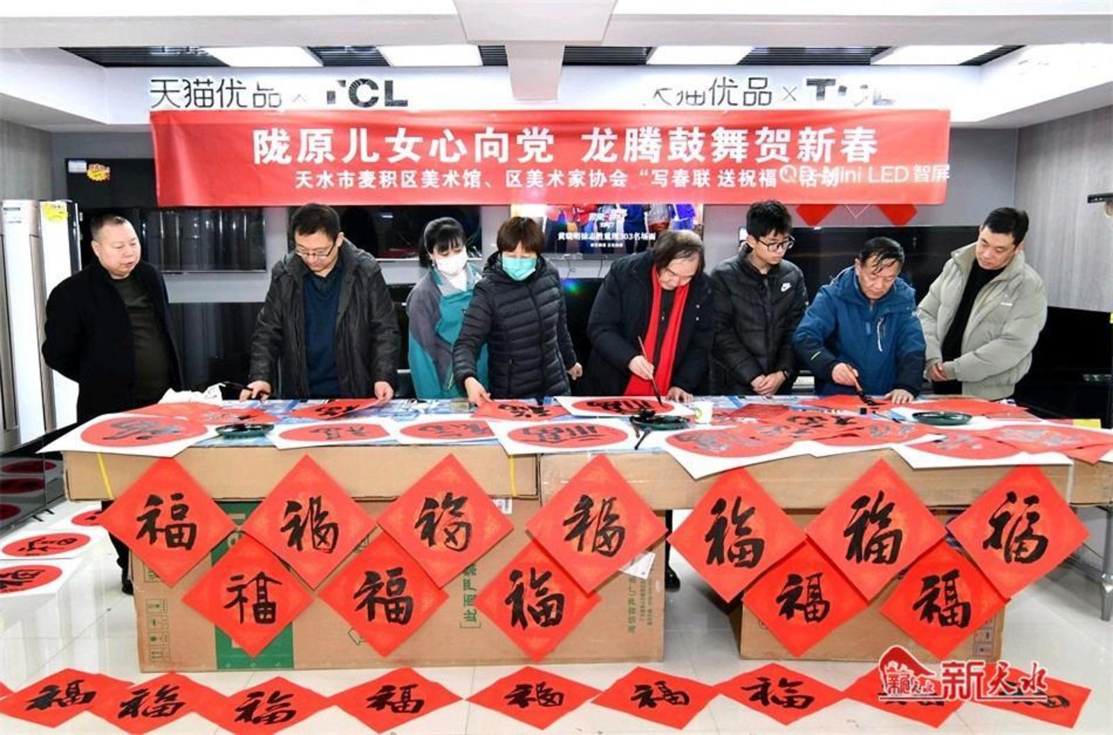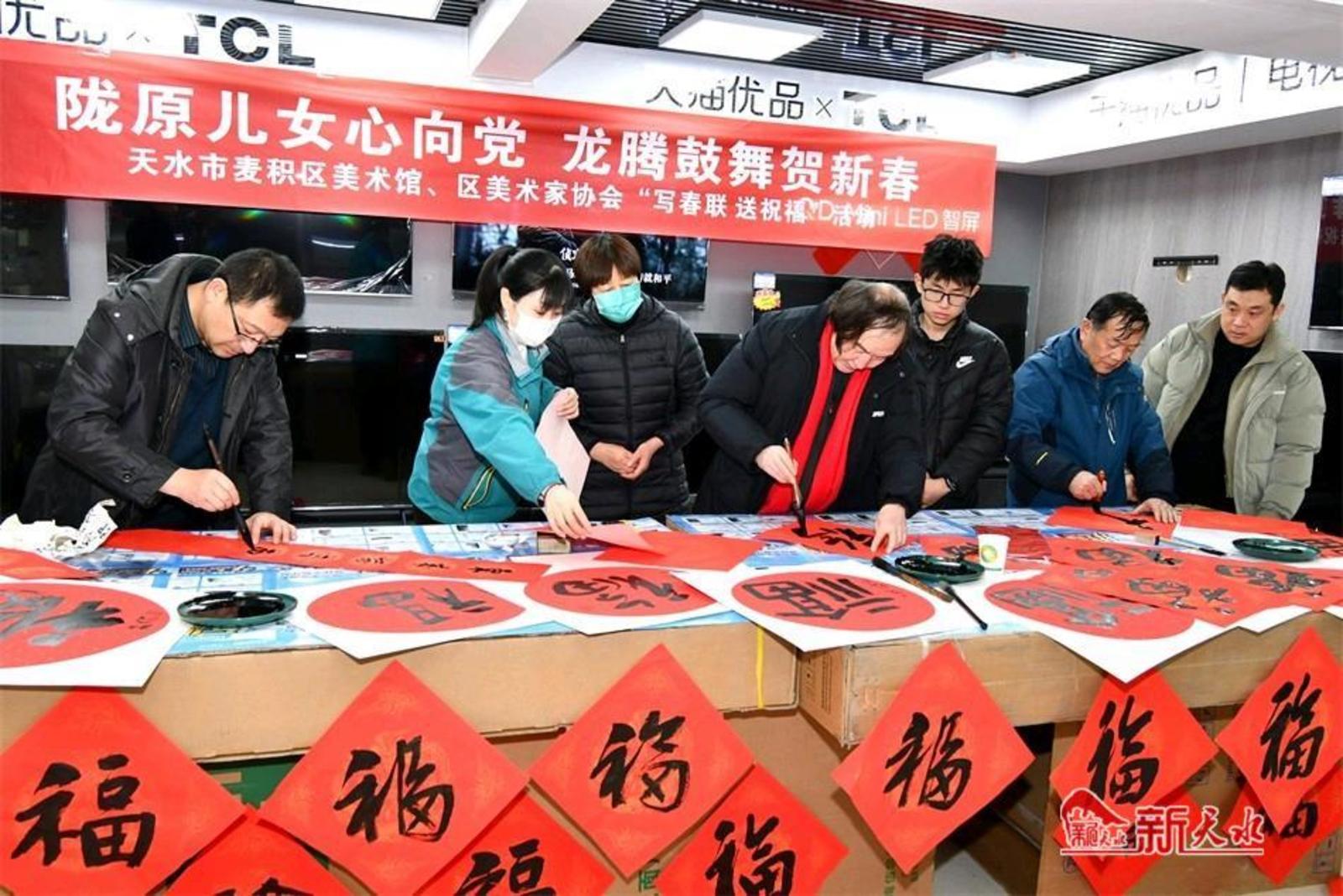 新天水讯【特约通讯员窦耀辉 通讯员窦艺】1月20日,麦积区美术馆、区美术家协会组织文艺志愿者,走进新桥南·国际购物广场开展“陇原儿女心向党·龙腾鼓舞贺新春”——“写春联、送祝福”文艺志愿服务活动,为老百姓送上红红火火的“精神年货”和节日祝福,营造出全民喜迎龙年新春的浓厚氛围。