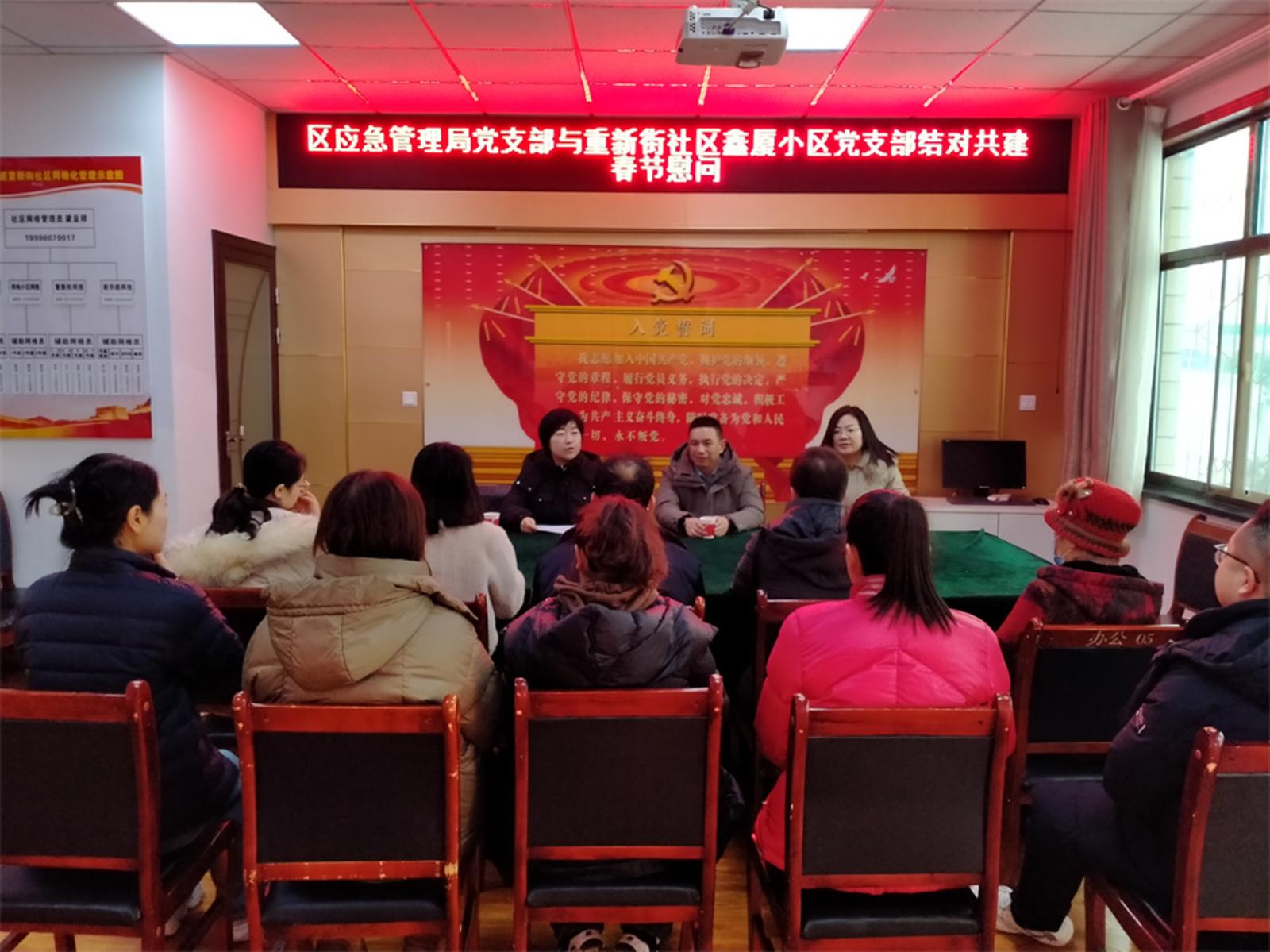 在新春佳节即将到来之际,区应急管理局党支部与中城街道重新街社区鑫厦小区党支部开展结对共建慰问活动,慰问困难党员、困难居民,为他们送去党和政府的温暖与关怀,并表达诚挚的问候。慰问中,工作人员详细询问了他们的身体状况和生活情况,并嘱咐他们要好好保重身体,有困难及时向社区反映。通过春节前的慰问,让贫困家庭温暖过冬,幸福过年,使困难人员家庭感受到党和政府对他们的关爱。