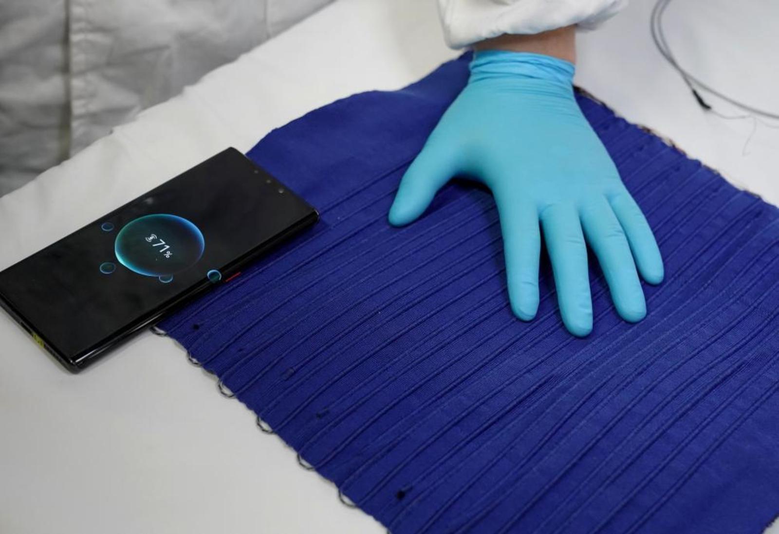 4月22日,复旦大学科研人员展示手机可放在编织有纤维电池的织物上充电。新华社记者刘颖 摄