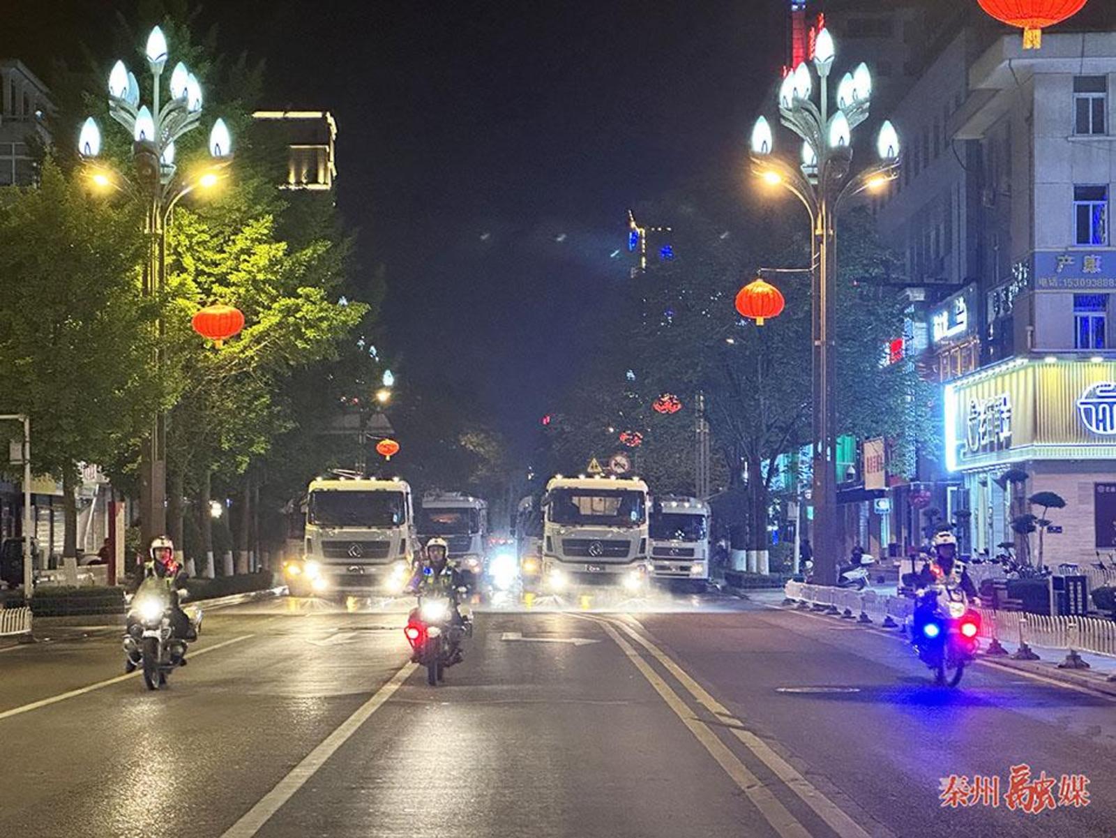 4月30日晚上11点,记者在城区主干道看到一辆辆大型环卫作业车辆正缓缓驶过,洒水洗扫、降尘,无缝隙覆盖了整个车道,车过之处路面变得湿润整洁,焕然一新。人行道上,随处可见环卫工人忙碌的身影,他们熟练操作清洗设备,对人行道进行精细清扫。