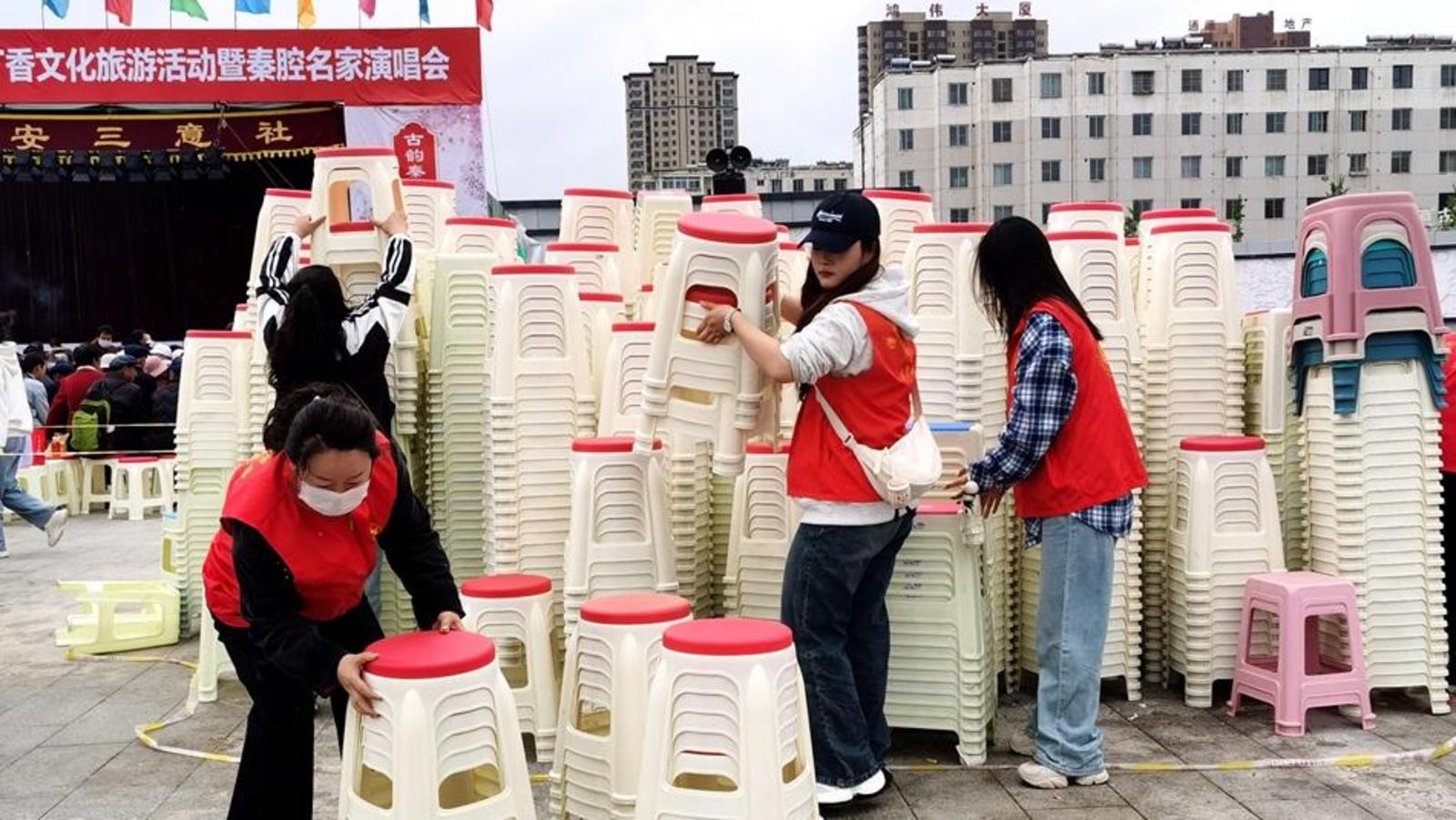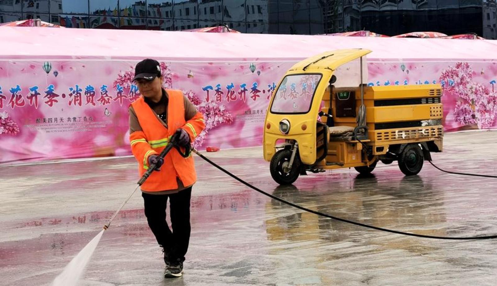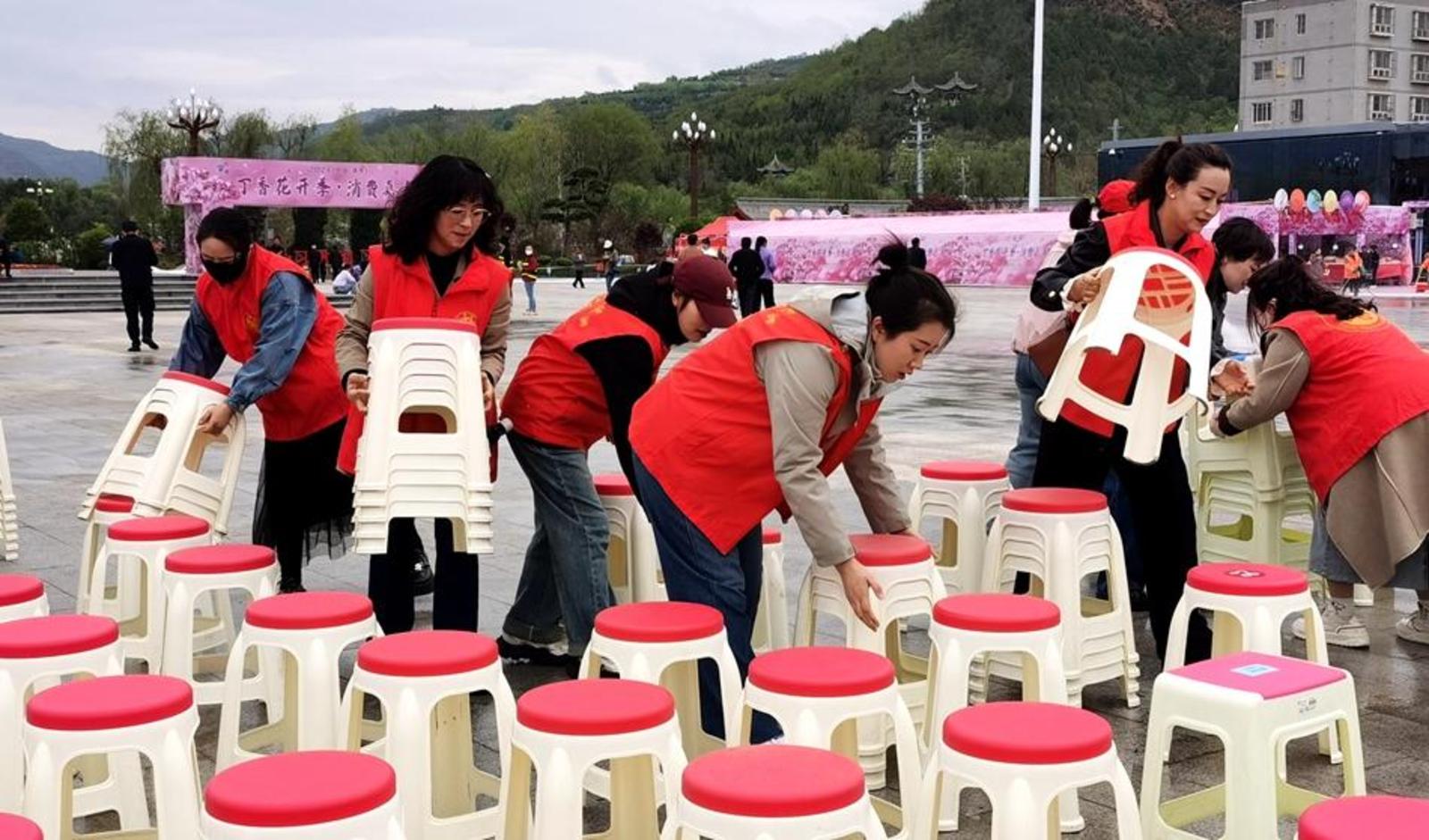 “五一”假期,环卫工人一大早就对轩辕广场地面进行清扫清洗,给广大游客和市民创造一个干净整洁的环境。身穿红马甲的志愿者们忙碌在活动现场,为广大观众摆放好板凳,在节目演出后收拾凳子、打扫卫生,用实际行动弘扬着“奉献、友爱、互助、进步”的志愿服务精神。