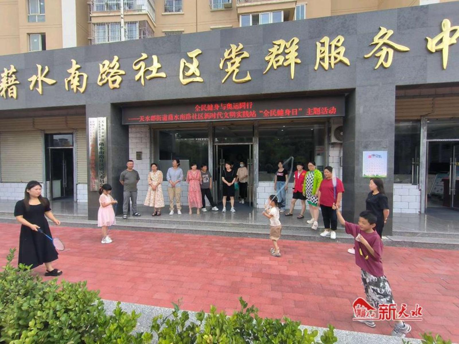 新天水讯 今年8月8日是我国第16个“全民健身日”。8月6日,秦州区天水郡街道藉水南路社区新时代文明实践站开展了以“全民健身与奥运同行”为主题的全民健身日主题活动,以借助广大群众关注奥运、支持奥运的热情,引导大家积极投身全民健身。