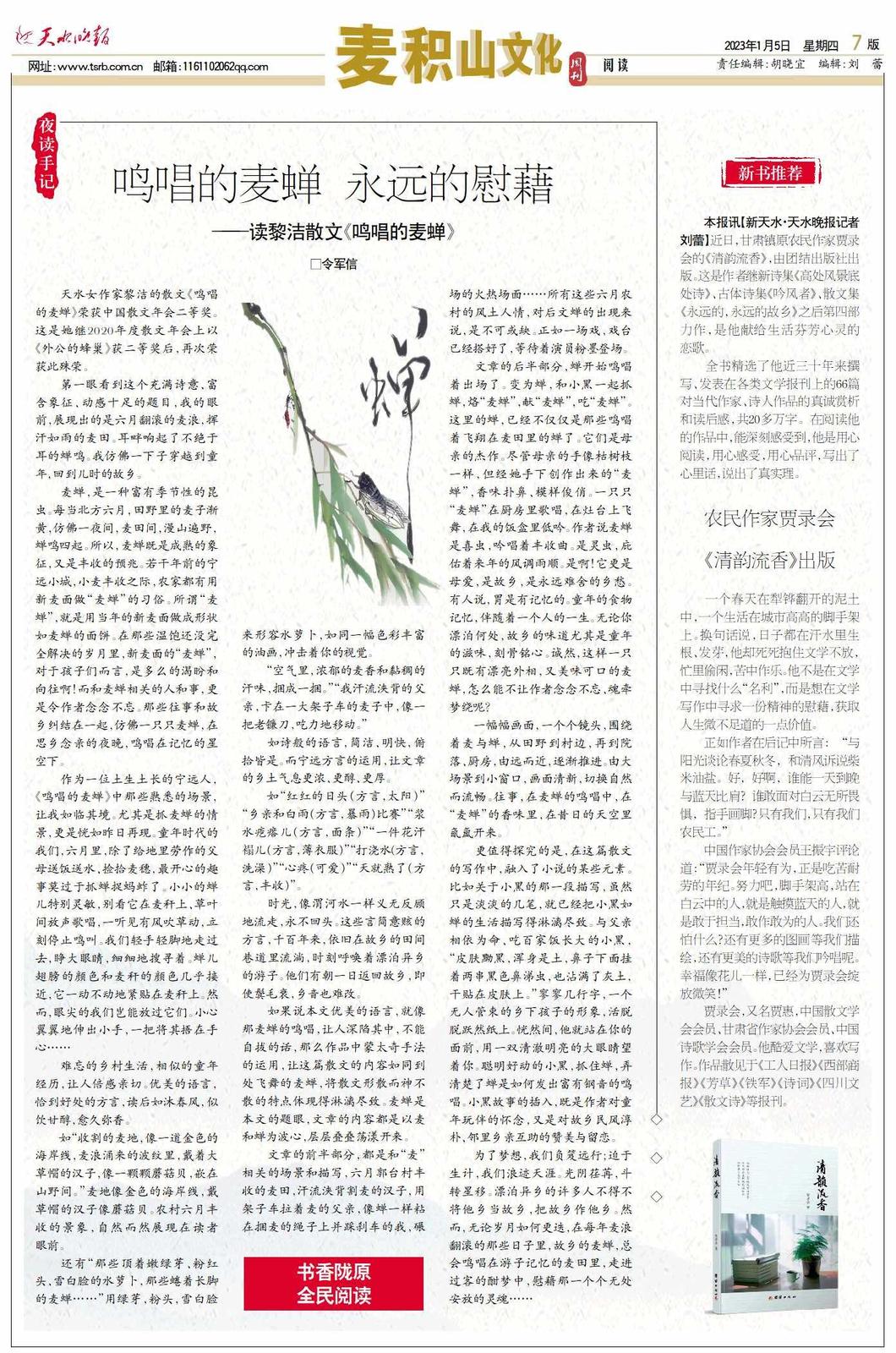 天水女作家黎洁的散文《鸣唱的麦蝉》荣获中国散文年会二等奖。这是她继2020年度散文年会上以《外公的蜂巢》获二等奖后,再次荣获此殊荣。