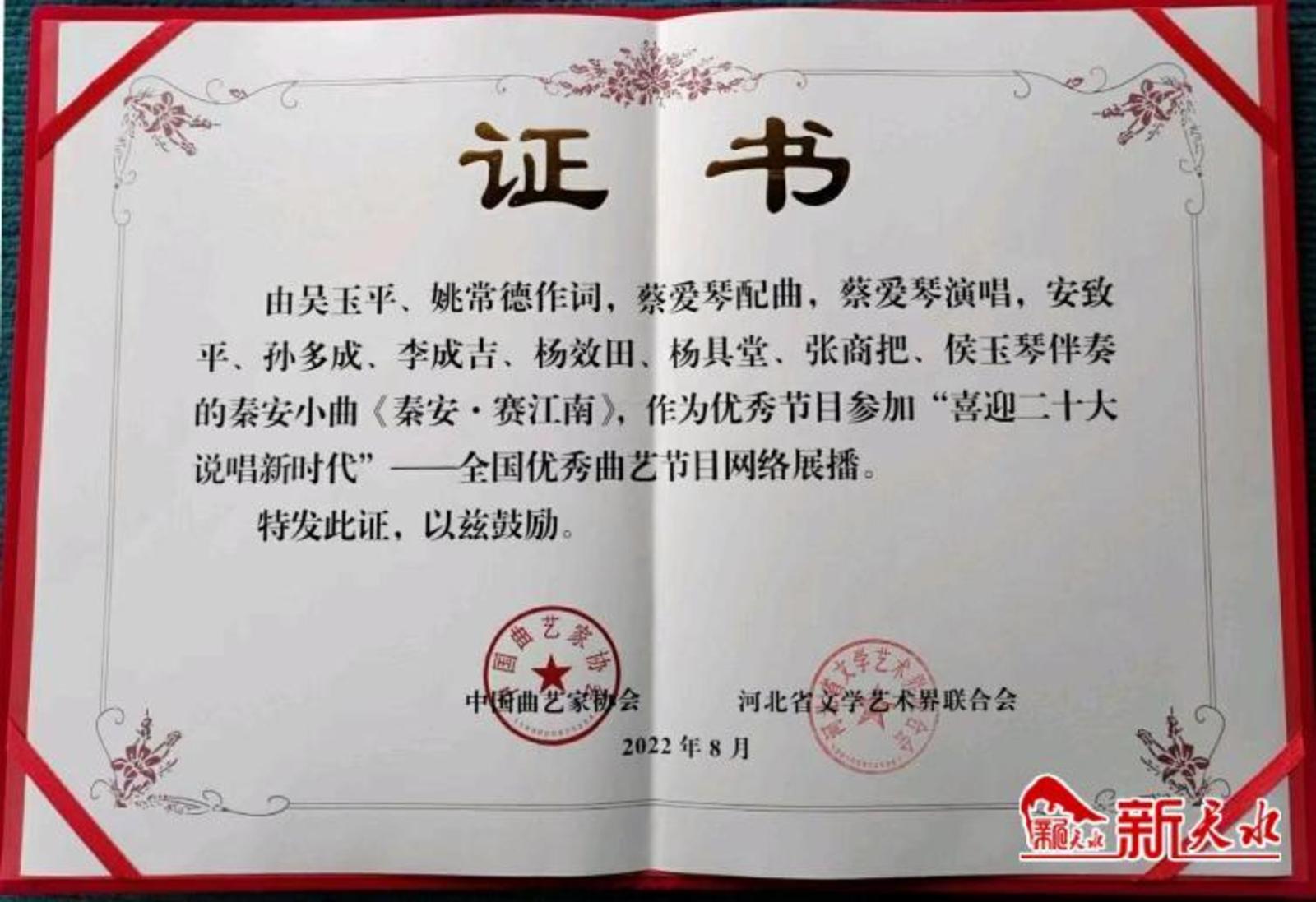新天水讯【通讯员 石建云】1月10日,秦安小曲《秦安·赛江南》创作团队收到了由中国曲艺家协会、河北省文化艺术界联合会颁发的展播证书。