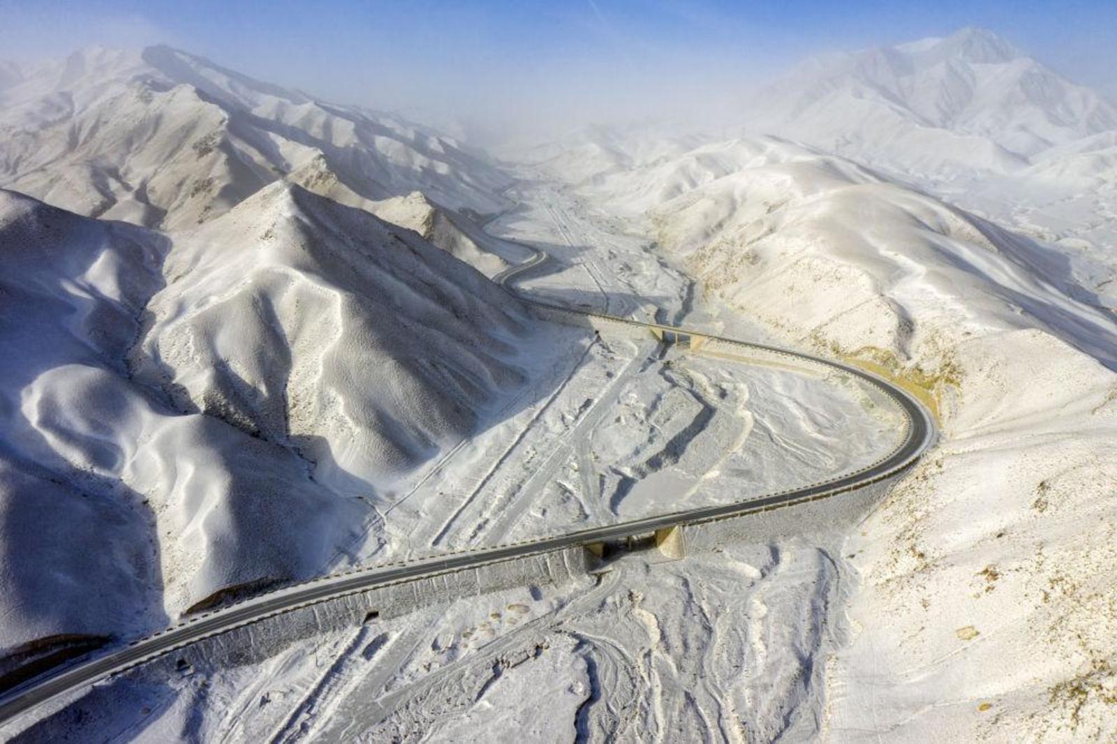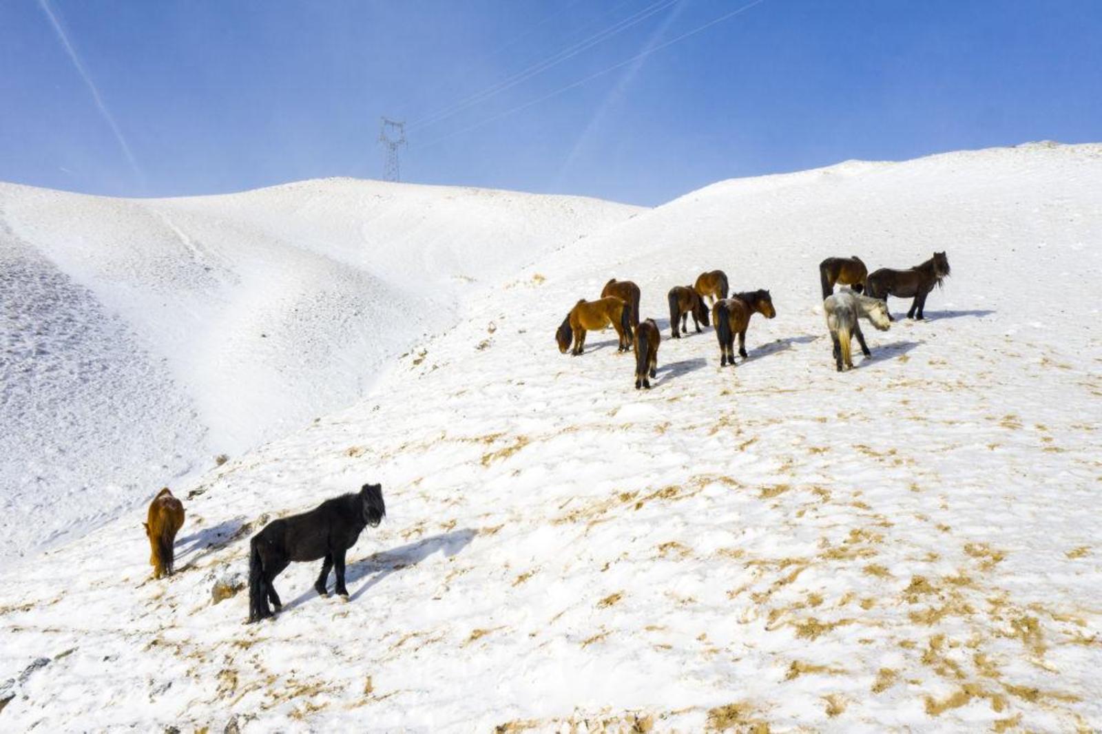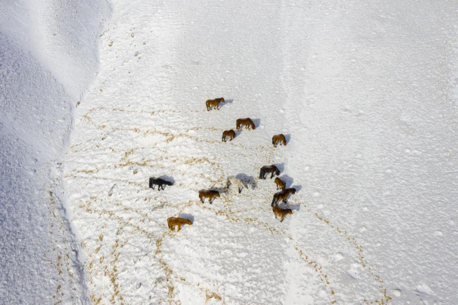 一场降雪过后,在甘肃省酒泉市阿克塞哈萨克族自治县境内的祁连山区,成群动物在白雪覆盖的山间觅食,景色如画。
