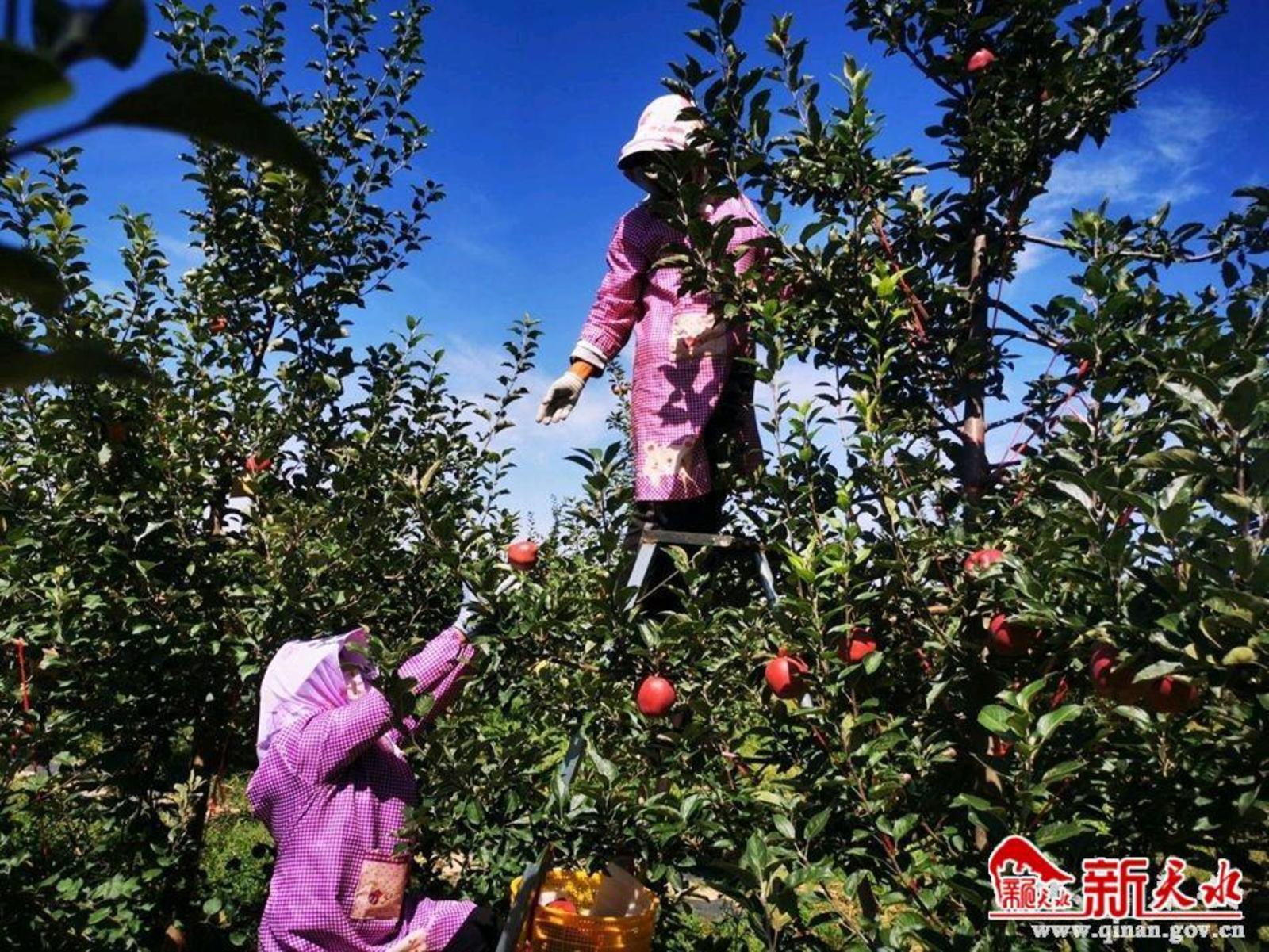 金秋时节,秦安县60余万亩苹果迎来丰收,全县大大小小的苹果园里,红彤彤的苹果挂满枝头,散发着诱人的清香,果农们忙着采摘、分拣、包装、外运,一车车精包装的苹果满载起运,销往全国各地,并且凭借良好的品质受到市场青睐,秦安苹果迎来产量和效益双丰收。秦安县果业管理局负责人介绍说:“秦安全县苹果总面积61.37万亩,总产量87.2万吨,总产值25.3亿元。”