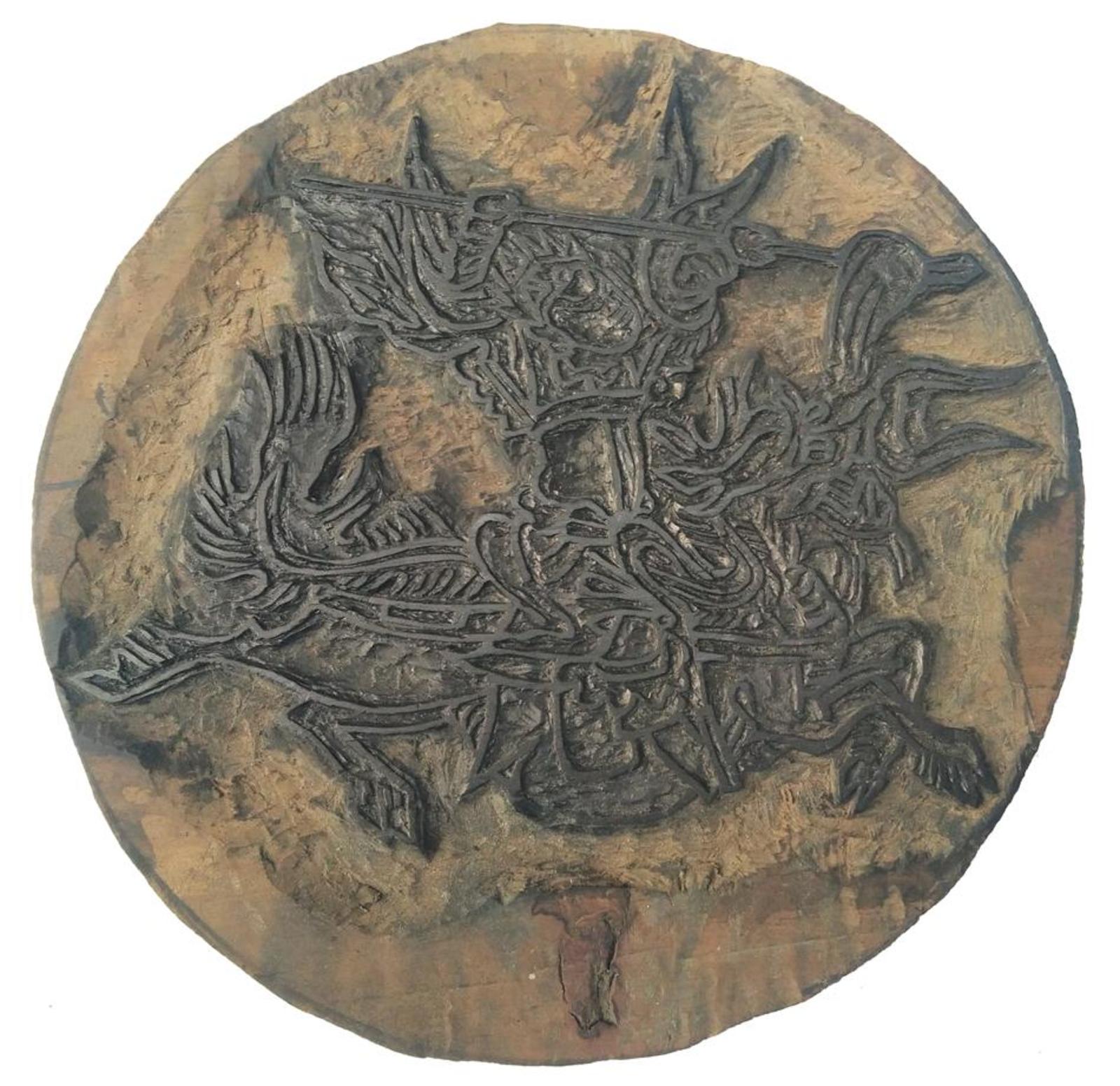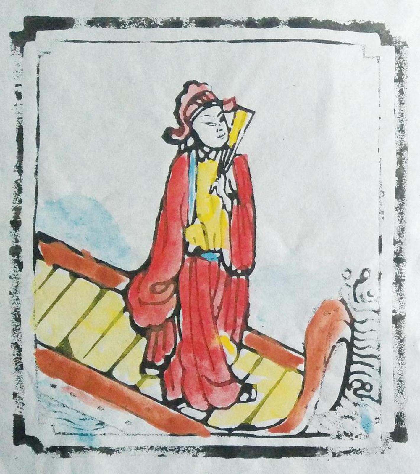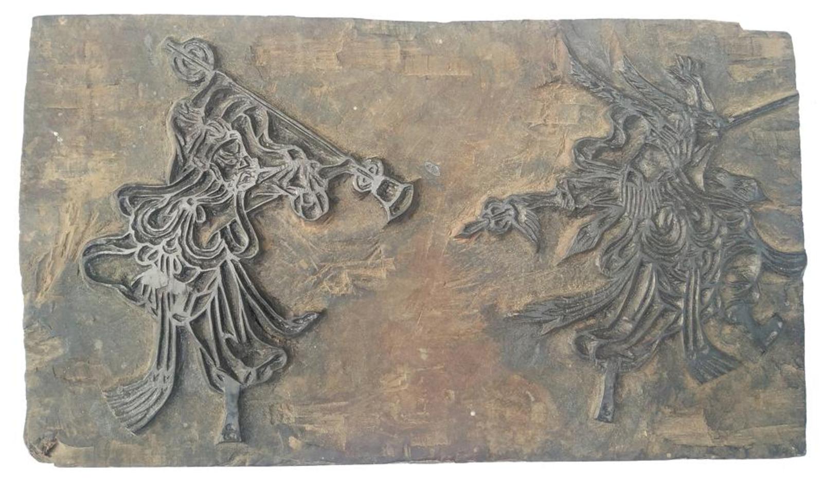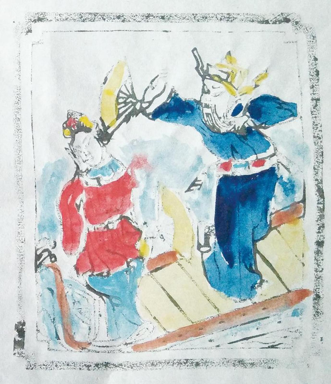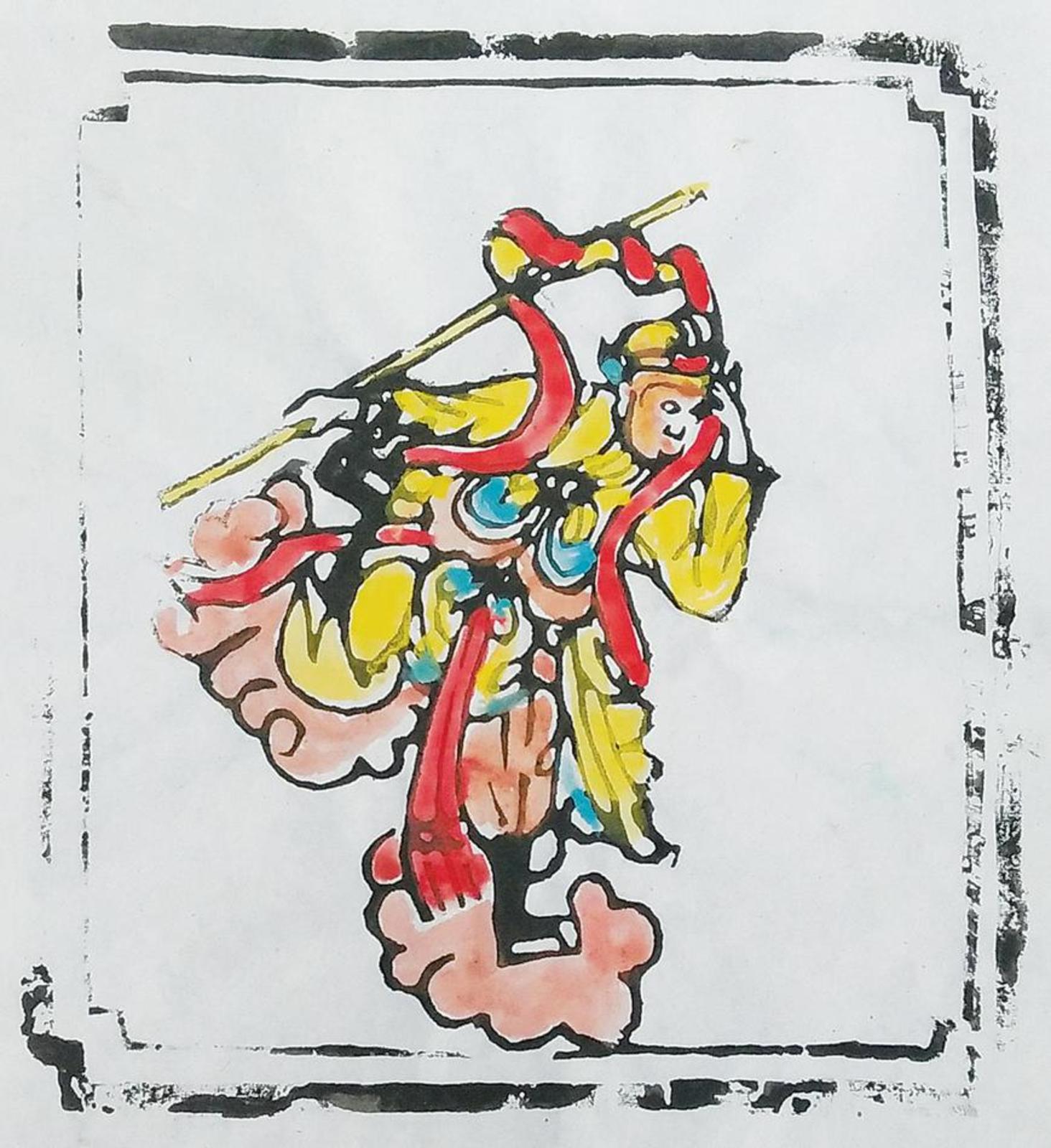 县璋老人保存下来的雕版数量并不多,共有6块,一部分正反两面雕刻,共17个图案,最古老的雕版由他曾祖父所刻,经岁月磨蚀,包浆醇厚。近年来,县老自己也创作了几种雕版,有的人物面部整体采用“打空”手法,拓印后仅存轮廓,后期二度创作时可使人物面部表情灵活变化。他同时还将小鸟、蝴蝶等装饰性图案直接刻在印版上,制作更方便省力。