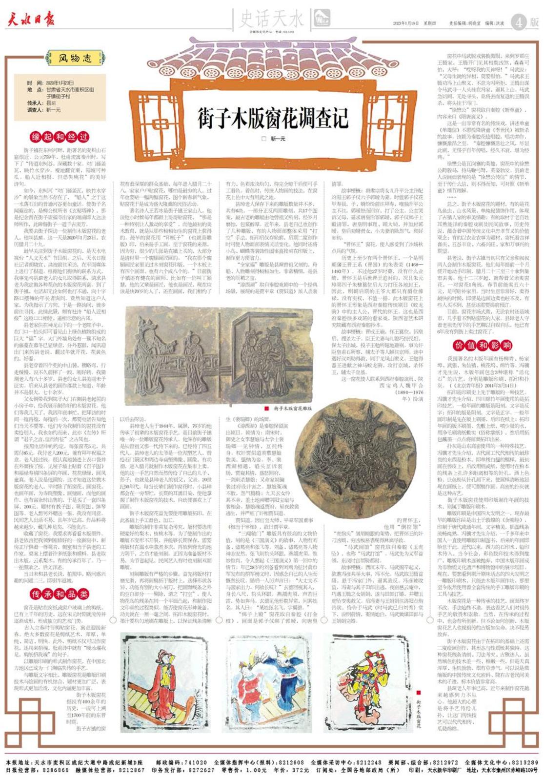 最早关注到街子木版窗花的,是天水电视台“人文天水”节目组。之后,天水日报社记者胡晓宜、洪波前往采访,在平面媒体上进行了报道。根据他们提供的联系方式,我事先与县瑄老人的女儿取得联系,请求县老为我定做各种花色的木版窗花两套。到了街子镇,电话却无论如何也打不通,向十字路口摆摊的年长者询问,竟然知道这户人家,为我指示了方向,于是一路询问,徒步前往寻找。此情此景,颇有杜诗“船人近相报”这般口口相传、遥相示意的古风。