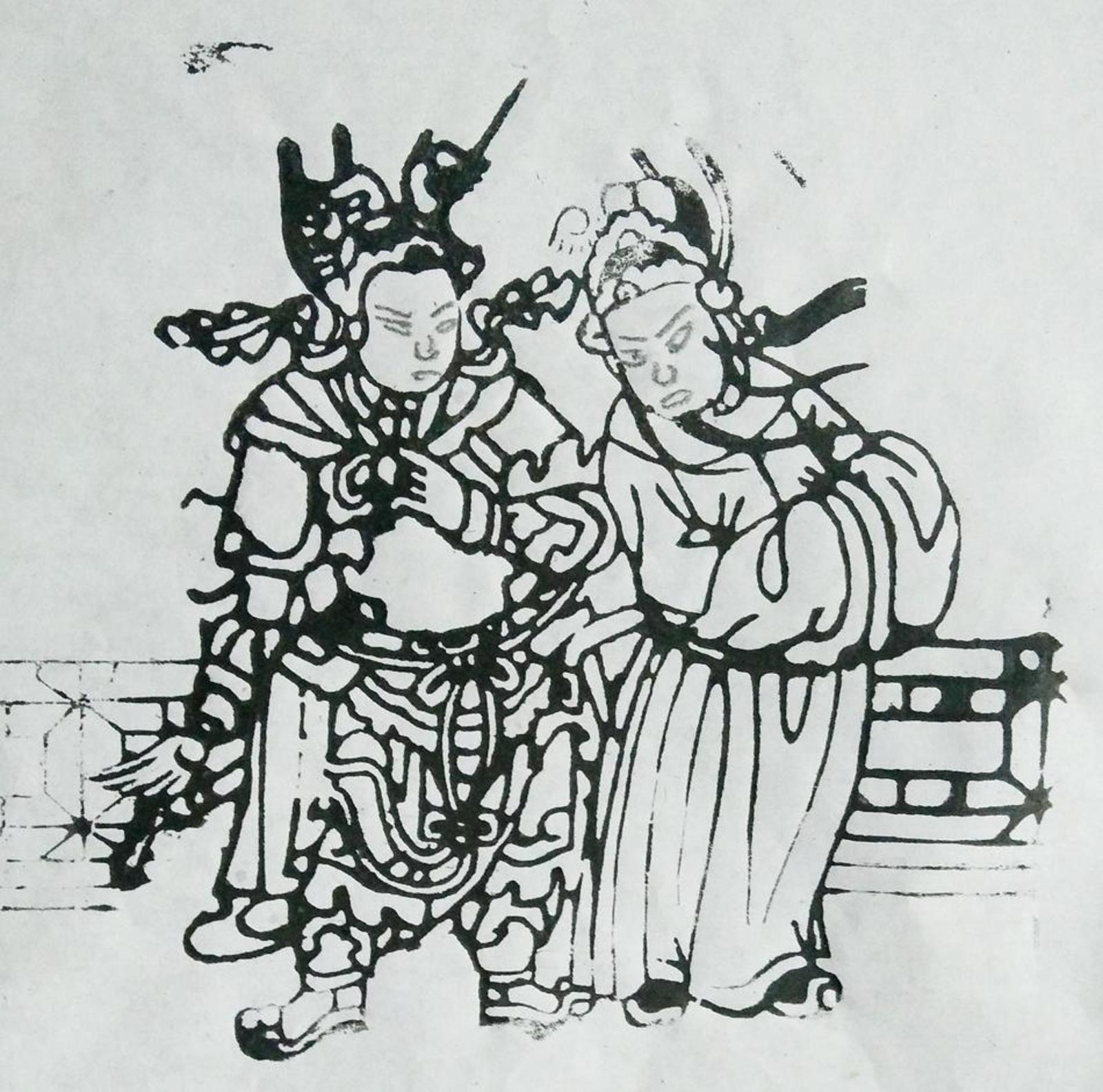 历史上至少有两个晋怀王,一个是明朝藩王晋王系(晋国)的朱表荣(1468—1493年),不过他27岁时薨,没有什么业绩,晋怀王是后世晋王追封的,况且朱元璋第四子朱棣篡位后大力打压各地封王,因此,明朝后期的王爷大都只有爵位俸禄,没有实权,不值一提。此木版窗花上的晋怀王形象是西府秦腔传统剧目《蛟龙驹》中的主人公,晋代的怀王。这也是西府秦腔很多戏班的看家戏,陕西省艺术研究院藏有西府秦腔抄本。