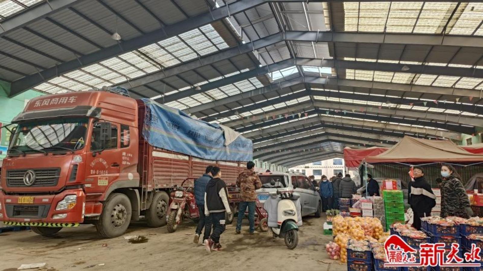 早上10时许的洛门蔬菜批发市场热闹非凡。大货车进出有序,有的拉来了外地水果,有的运走了本地蔬菜,车里装得满满当当;商贩们忙前忙后,一边张罗着摊位的生意,一边把各种蔬菜水果装满三轮车,送到各个乡村……