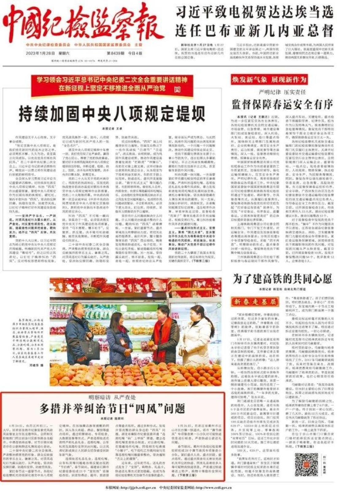 紧盯春节这一重要节点,各级纪检监察机关持续深化落实中央八项规定精神,在加强廉洁教育提醒的同时,深入各大商超、酒店、餐馆等重点场所,通过明察暗访、专项检查、大数据监督等方式,严查违规收送名贵特产和礼品礼金、违规吃喝、公车私用及其隐形变异突出问题,以正风肃纪新成效让人民群众切身感受到新年新气象。
