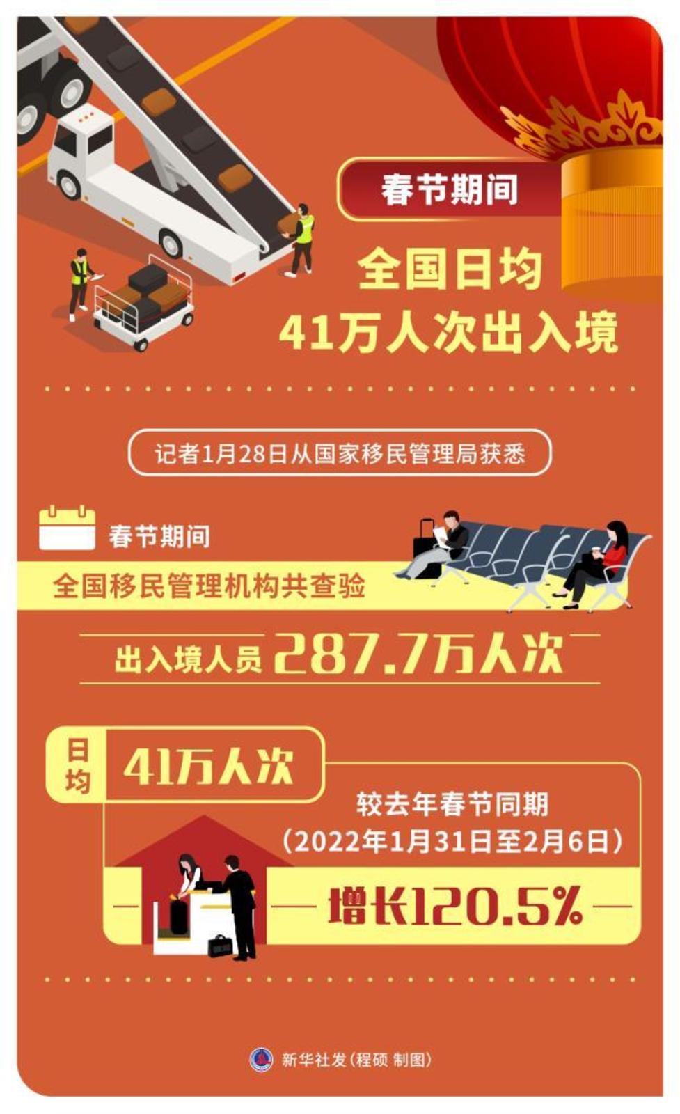新华社北京1月28日电(记者任沁沁)记者28日从国家移民管理局获悉,春节期间,全国移民管理机构共查验出入境人员287.7万人次,日均41万人次,较去年春节同期(2022年1月31日至2月6日)增长120.5%。