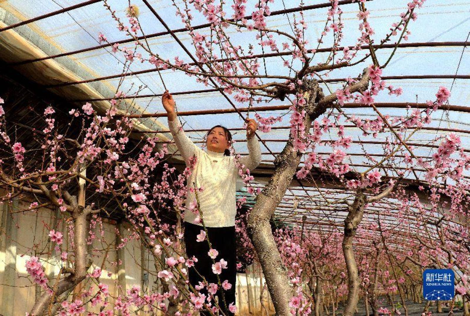 1月28日,在甘肃省平凉市静宁县城川镇吴庙村的暖棚里,桃花竞相绽放,果农在给桃花授粉。