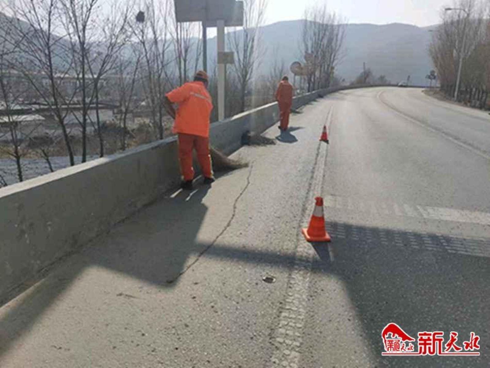 针对春运期间车流量增多,路面各类垃圾也随之增加的情况,清水公路段加大路面保洁与清扫力度,采用机械+人工相结合的方式,对公路范围内垃圾进行清扫,对乡镇路段公路两侧倾倒的生活垃圾、铺撒的防滑料进行全面清理回收,确保路面干净整洁。对损坏的交通安全设施及时进行了修复,确保其完好无损,努力营造更加安全畅通、干净整洁的路域环境。