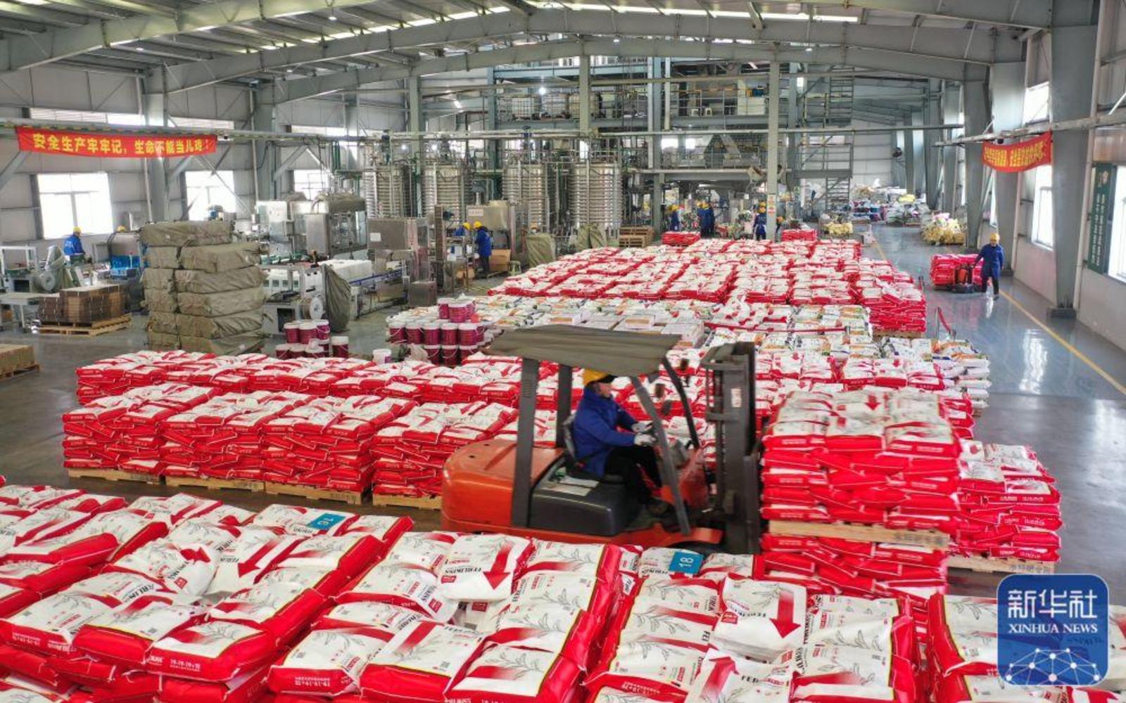 1月29日,四川一家公司员工用叉车搬运化肥(无人机照片)。新华社发(姚永亮摄)