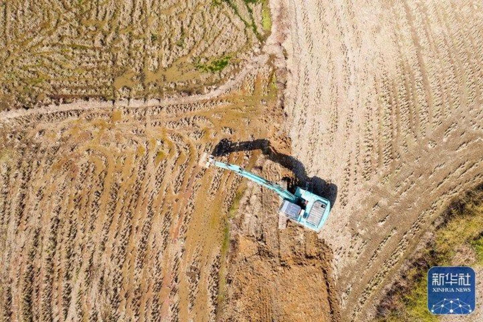1月29日,在江西省抚州市金溪县秀谷镇五里村高标准农田建设现场,施工人员开动机械设备建设高标准农田。新华社发(邓兴东摄)