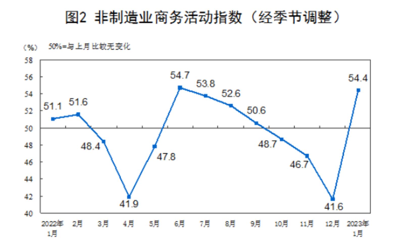 1月份,非制造业商务活动指数为54.4%,比上月上升12.8个百分点,重返扩张区间,非制造业景气水平触底回升。