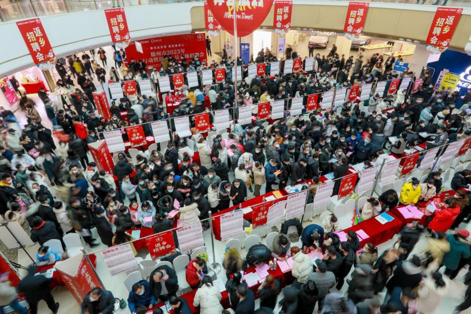 1月27日,求职者在山东省滕州市2023年春风行动暨返乡人员专场招聘会上寻找适合自己的就业岗位。新华社发(宋海存 摄)