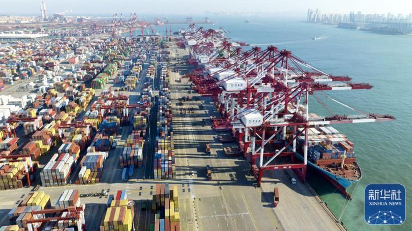 繁忙的青岛港前湾集装箱码头(1月27日摄,无人机照片)。新华社记者 李紫恒 摄