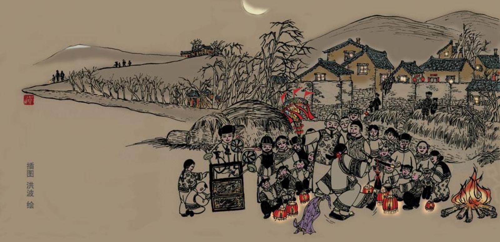 石堡村庄子不大,闹社火接“春官”的规模及热闹,也比不上大庄的踩高跷表演,但闹社火和耍、唱秧歌却很接地气。因有一批擅长表演杂耍、逗乐搞笑的艺术人才,其闹社火与耍、唱秧歌的影响力和吸引力并不比大庄子逊色。在抬鼓、“家伙”从早到晚的喧响声中,社火头会与被选聘为“春官”的候选人对接协商,确定闹社火接“春官”的日子。之后,石堡村闹社火就进入紧锣密鼓的实施阶段。到了接“春官”这天晌午饭后,根据协商确定的表演节目单,甄选表演者及各种角色,会化妆的匠人逐一给角色打扮化妆,并依其角色特点穿上花花绿绿的服装,戴上各式各样的帽子,拿上可以表演的长矛、大刀、棒槌、烟袋锅、白酒瓶等道具。闹社火节目中,有一出历史传承的林则徐禁鸦片,打击洋人偷运鸦片的表演,据说这个是从民国初流传下来的。待闹社火接“春官”时辰一到,随着号炮炸响、鼓乐齐鸣、长号嘹亮,表演队伍依序踏上去“春官”家的路上。石堡村社火表演队从后堡门进庄缓缓穿庄而行,虽没有骑大马的“探马”,但却有少年人身上挂着叮当作响的铜铃项圈,边跑边抖铜铃铛,在表演队伍前边往返奔跑。村民们则夹道欢迎,观摩尽情表演的各式演员。看,表演队伍中有“白蛇传”中的许仙、白素贞和小青;有千古传奇爱情故事“梁山伯与祝英台”剧中的一对情侣;有猪八戒背媳妇。还有鲁智深、武松等梁山好汉。