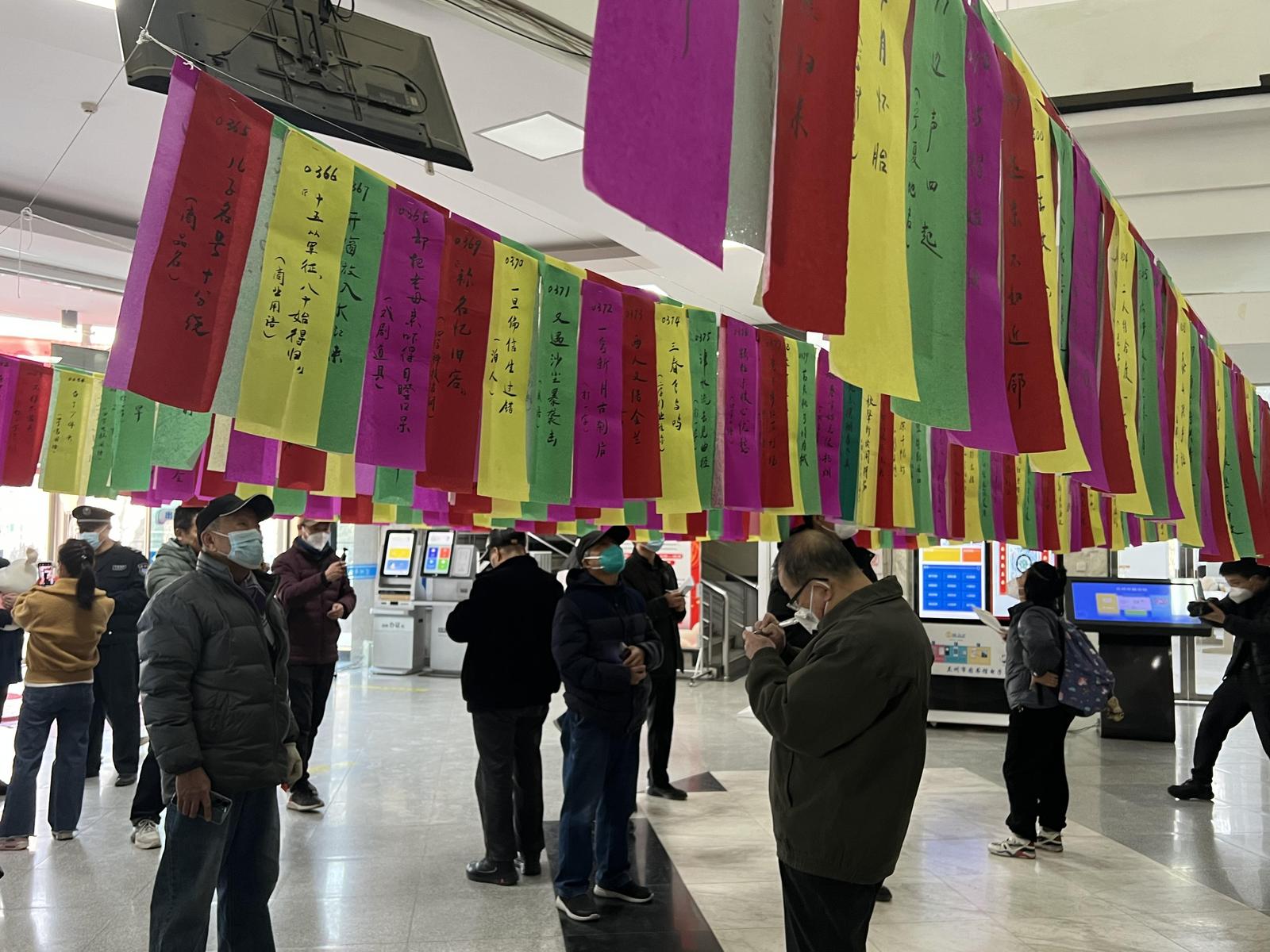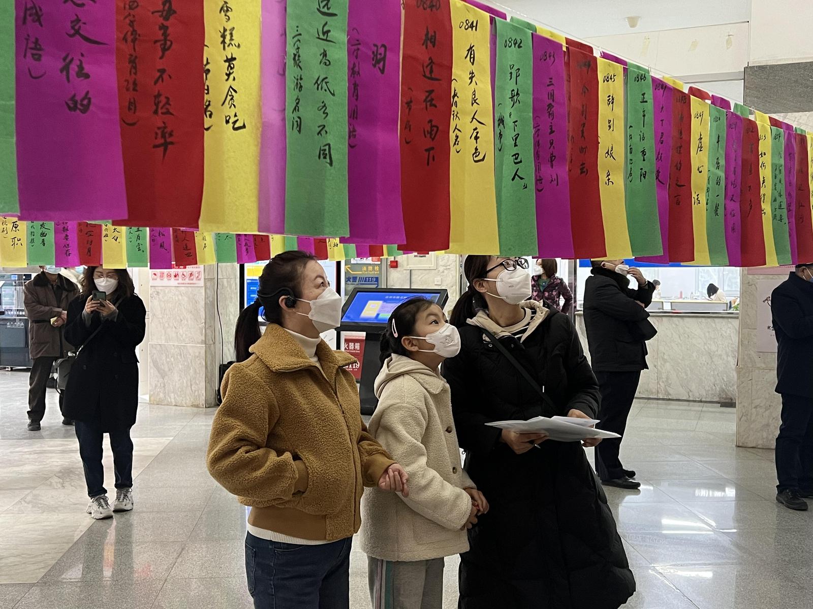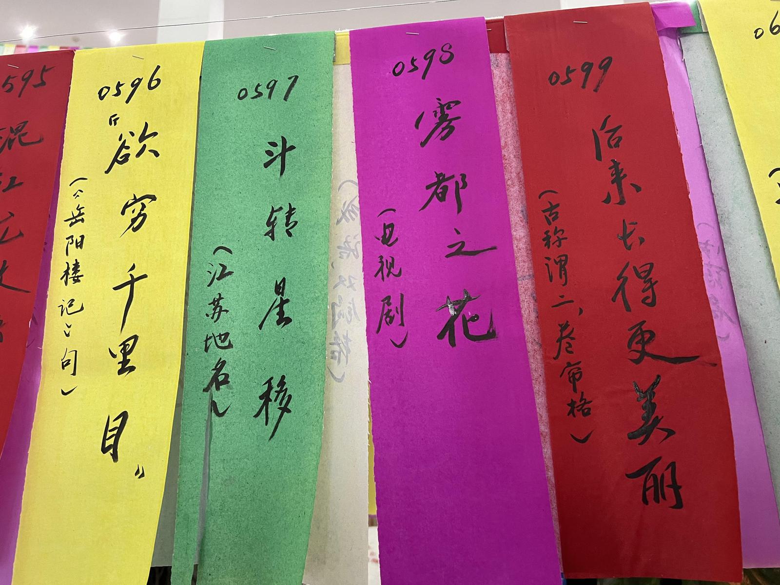 当日上午9时多,早早知晓活动消息的观众就陆陆续续来到兰州市图书馆,仰着头,在五彩斑斓的谜条中竞猜起来。