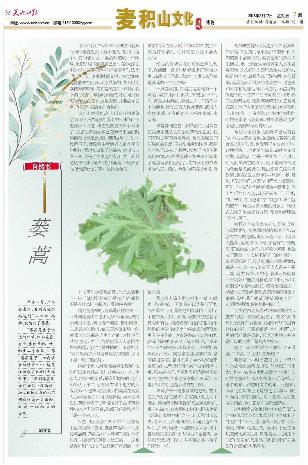 早春二月,开车去南京,看到高速公路边的“八卦洲”路牌,就想到了蒌蒿。