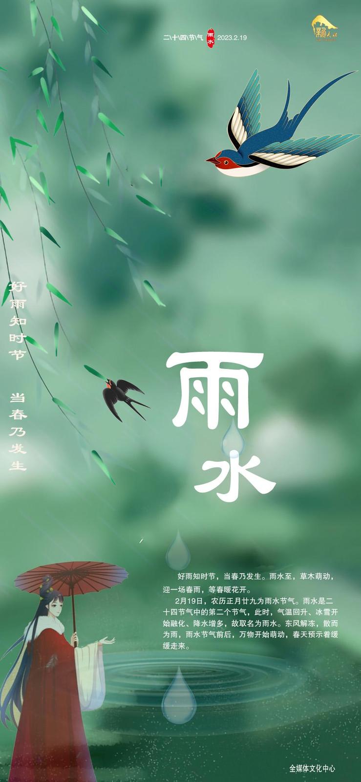 2月19日,农历正月廿九为雨水节气。雨水是二十四节气中的第二个节气,此时,气温回升、冰雪融化、降水增多,故取名为雨水。东风解冻,散而为雨,雨水节气前后,万物开始萌动,春天预示着正式来临。