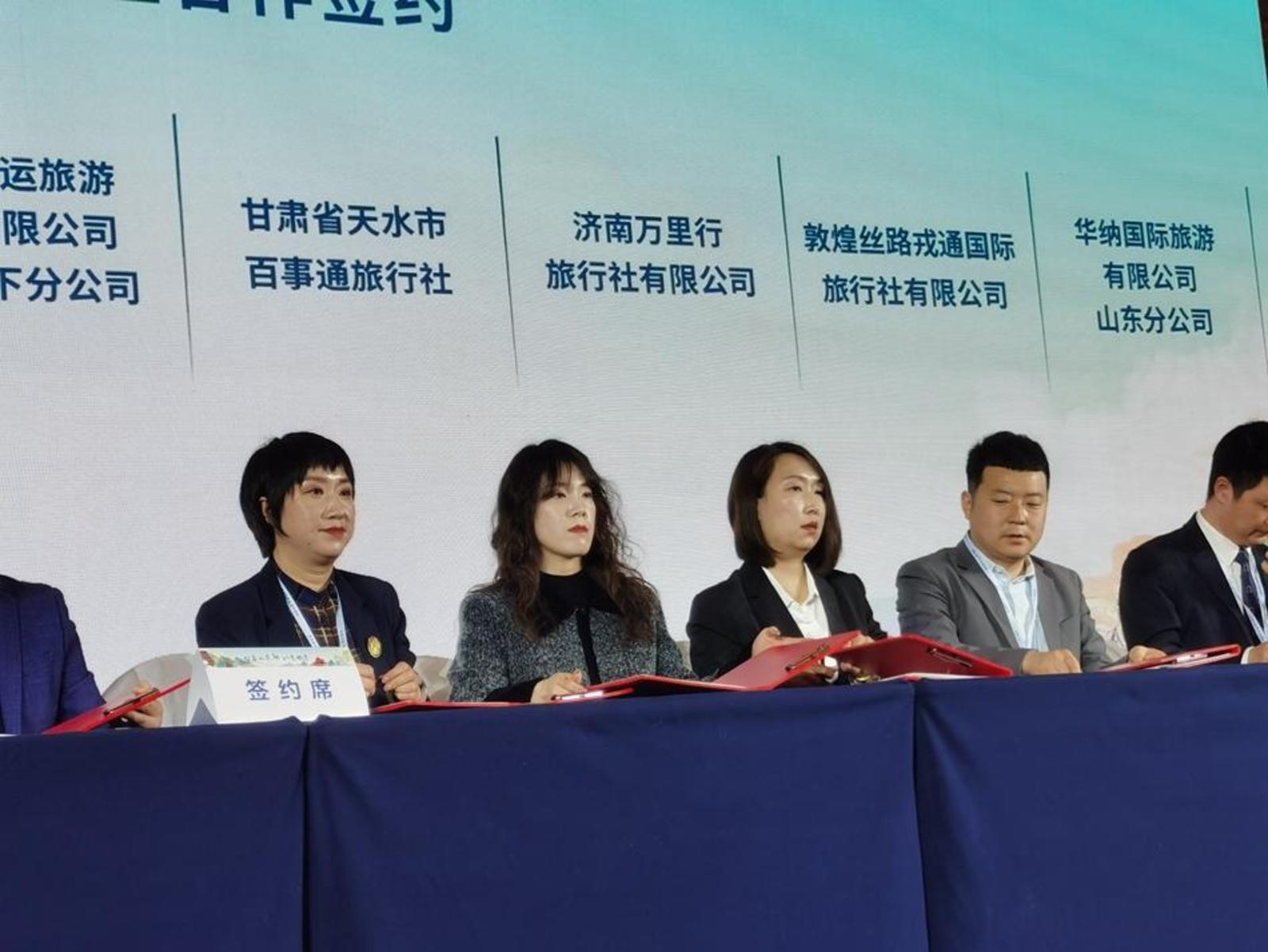 天水百事通旅行社和济南万里行旅行社签订了客源互送协议,为两地游客的通行建立了保障通道。甘谷雅路人麻编鞋业有限公司携天水非遗传承文创产品进行展示展销,得到了与会嘉宾的青睐和关注,有部分外贸经销商主动对接,希望能够合作销售。