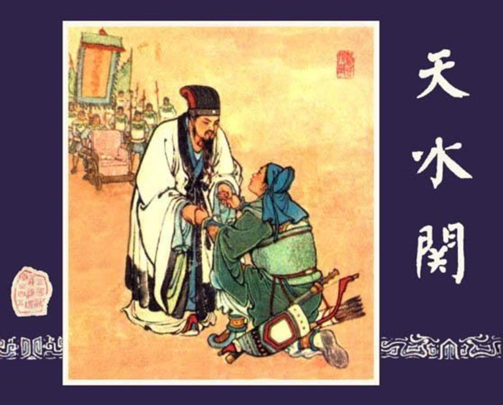 蜀汉建兴六年(公元228年),诸葛亮亲率大军出师伐魏,一路浩浩荡荡、势如破竹,一举攻下了祁山。诸葛亮设计智取安定、南安二郡,并生擒魏国驸马夏侯楙。在攻取天水郡时,遣心腹之人扮作魏将裴绪,入天水郡搬兵去救夏侯楙。这时,功曹梁绪、主簿尹赏和主记梁虔都认为夏侯楙乃金枝玉叶,应当火速发兵前往救援。天水郡太守马遵正要起兵时,计谋却被参军姜维识破:“驸马被困于南安,诸葛亮围得水泄不通,况且裴绪乃无名小将,怎么能杀出重围呢?更重要的是我们都没有见过他,这肯定是诸葛亮的诈降之计。”并向太守马遵献上一计,使前来乘机取城的赵云反而陷入了姜维所设的包围圈里,首尾不能相顾,大败而归,让诸葛亮的计划一时不能实现。诸葛亮自从出山以来,还不曾遇到过如此年轻且又智勇双全的对手,于是亲提大军前往天水。诸葛亮临阵一看,就知姜维的确是一员将才,心里甚为喜爱,便有意收归己用。他派人打听到姜维的母亲仍在冀县居住,便派一支军队前去攻打冀县,以引姜维前去冀县,又使离间计让太守马遵对姜维产生了怀疑。诸葛亮用粮草引诱姜维离开,魏延便乘机攻占了城池。姜维杀出包围圈后回返不成,又去投奔天水城。太守马遵这时已深信姜维现已降蜀,害怕姜维来诈降开城,便命军士用乱箭射杀。姜维无法入城,后面蜀兵又追了上来,不得已,便去投奔上邽,谁知又遭一顿乱箭。此时的姜维已走投无路,不由得仰首对天长叹。这时,只见羽扇纶巾的诸葛亮出现在他面前:“伯约为何不降。”姜维虽然无奈,但诸葛亮也是他敬佩之人,于是下马归降。诸葛亮连忙下车拉住姜维的手说:“我自从出茅庐以来,到处求访贤能的人,想把我平生所学,毫无保留地传授,但一直没有遇到合我心意的人。今天和伯约相逢,也就了却了我的一桩心事。”姜维闻之喜出望外,连忙躬身拜谢诸葛亮的知遇之恩。