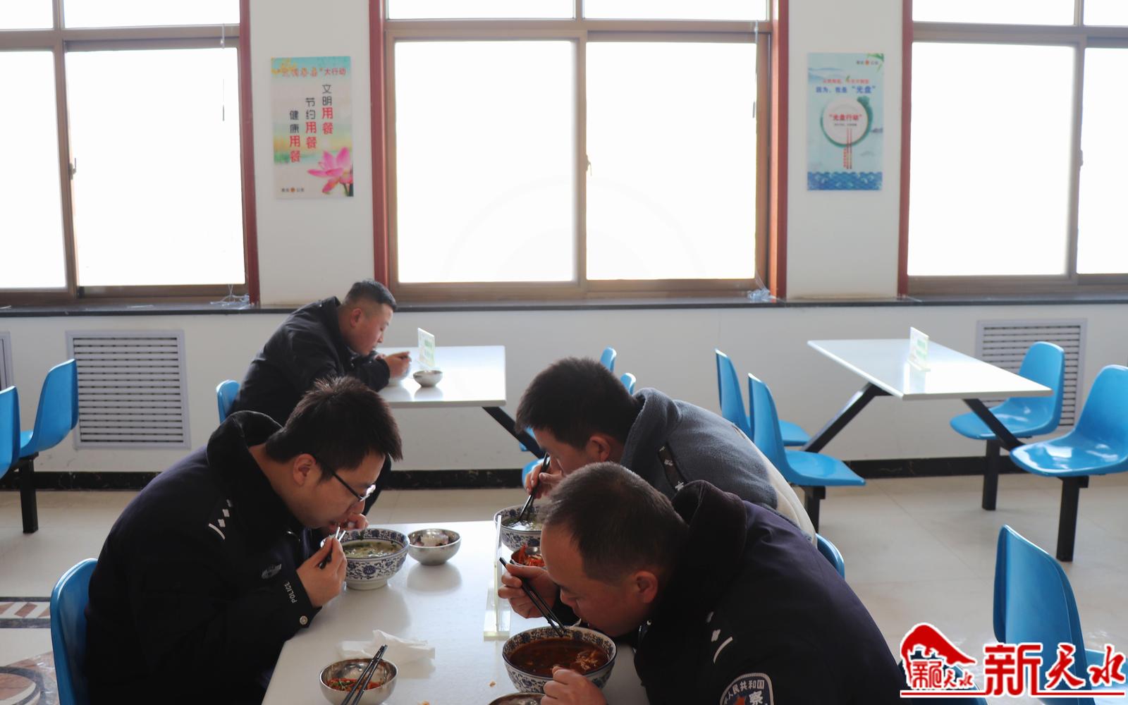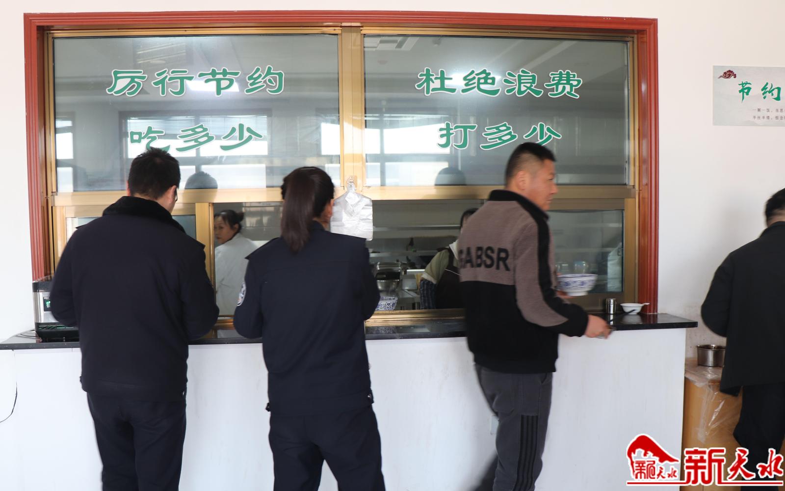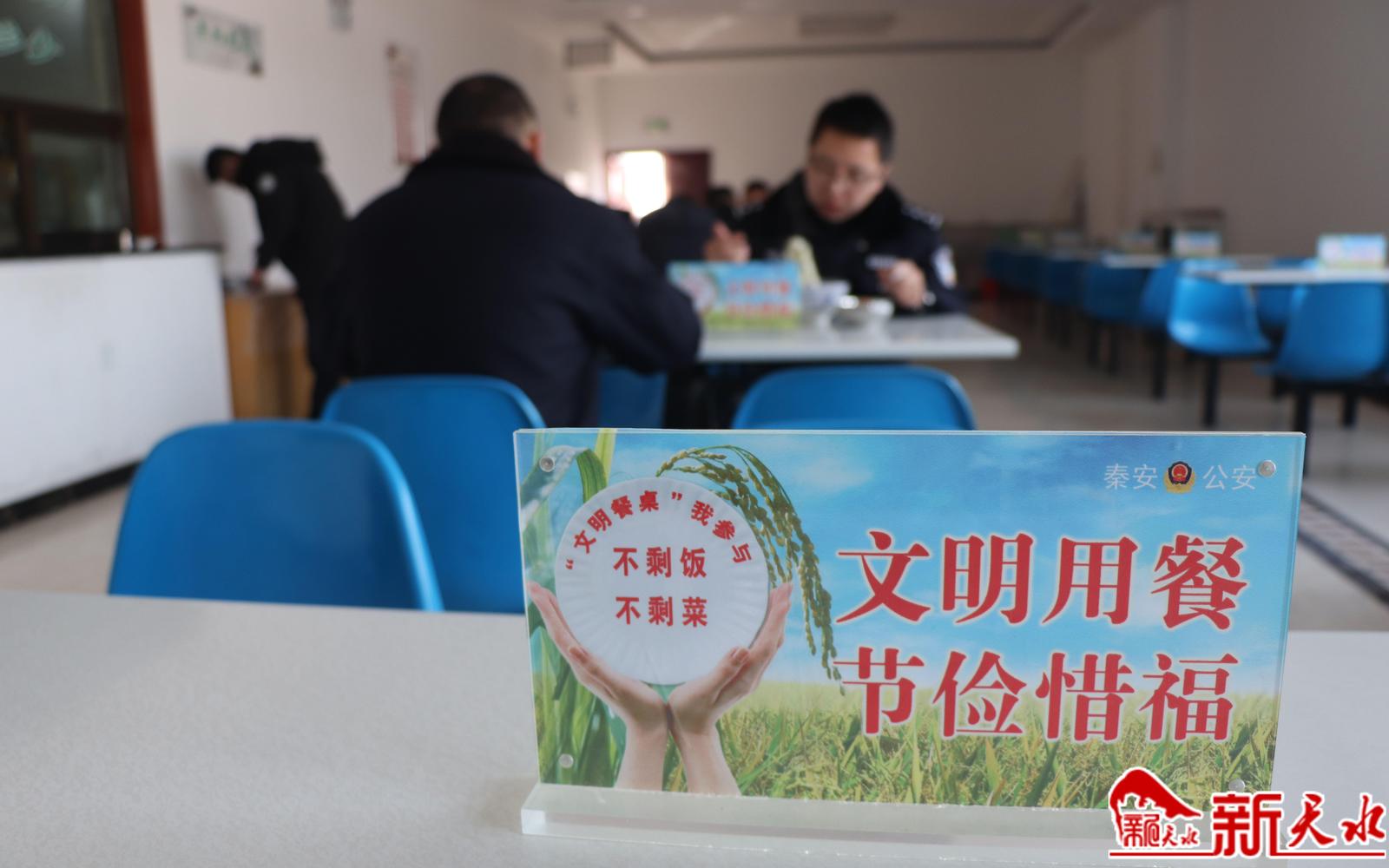 走进秦安县公安局机关餐厅,只见墙壁上张贴着“节约光荣”“文明用餐、节约用餐、健康用餐”等内容的宣传海报;餐桌上摆放着写有“文明餐桌我参与”等内容的桌牌;在取饭窗口处,贴在玻璃上的“厉行节约、杜绝浪费,吃多少、打多少”14个绿色大字格外醒目,民辅警排着队依次按需取餐。