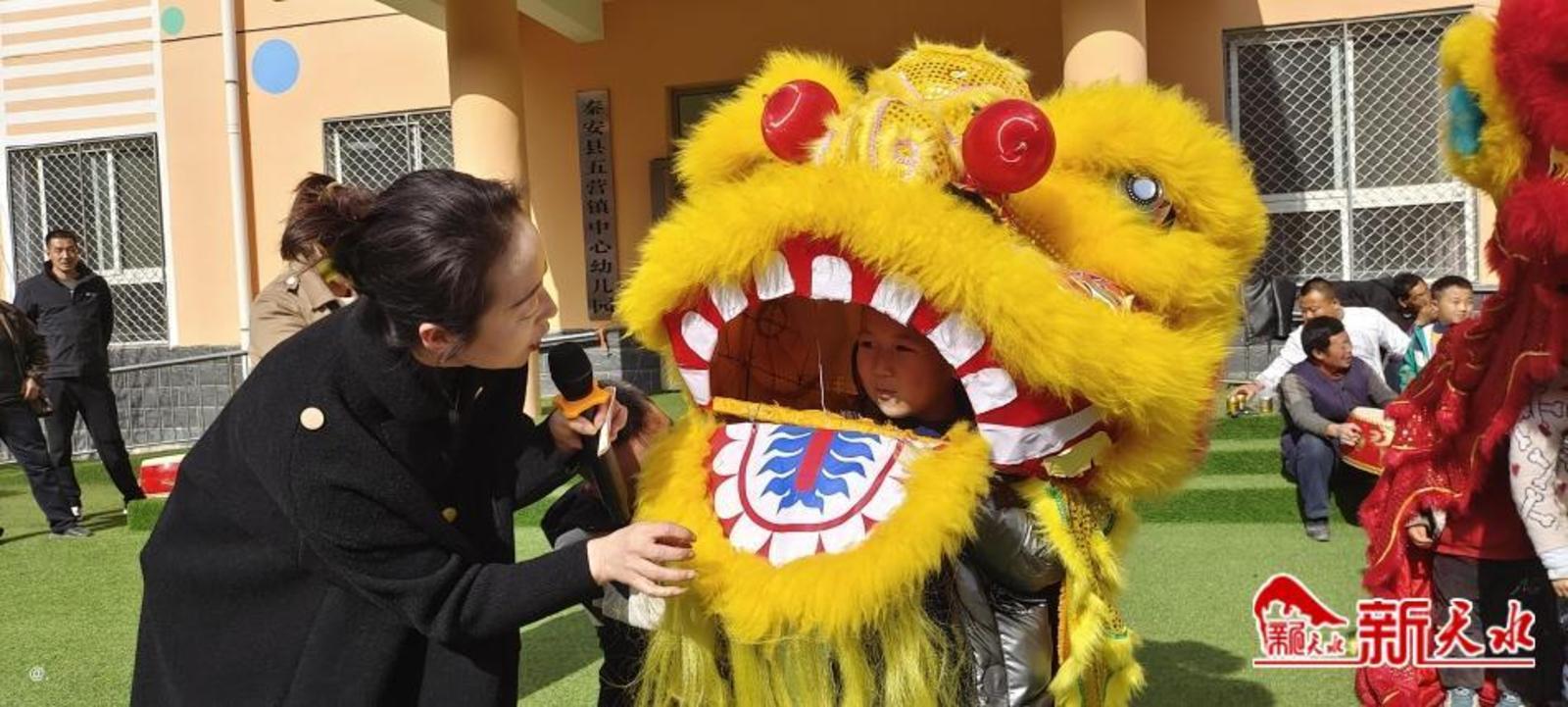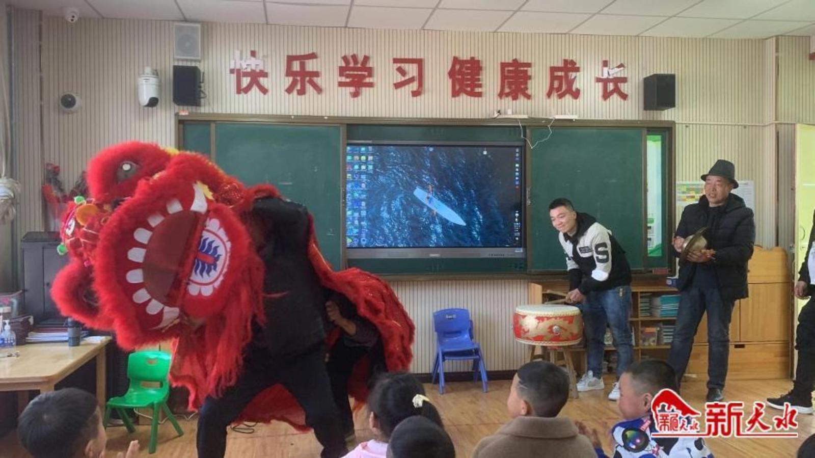 新天水讯【通讯员桑亮亮】2月24日,秦安县五营镇中心幼儿园开展传统文化进校园活动,民间艺人为孩子们讲述舞狮文化、传授舞狮技艺。