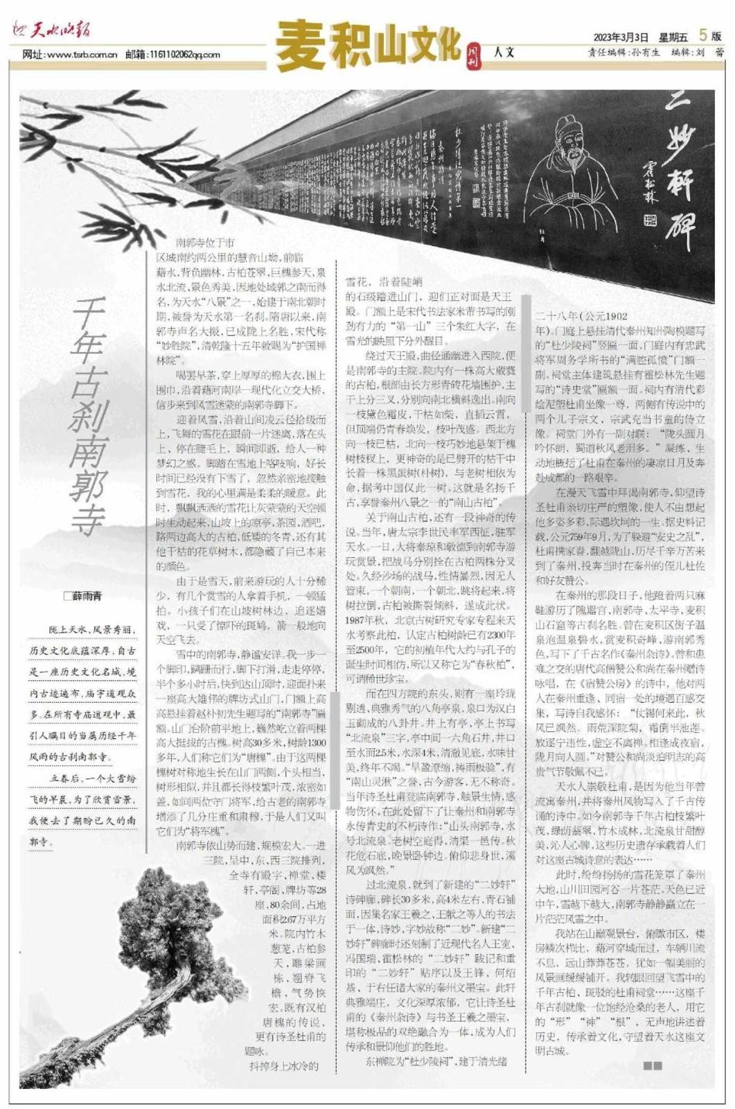 我站在山巅观景台,俯瞰市区,楼房鳞次栉比,藉河穿城而过,车辆川流不息,远山莽莽苍苍,犹如一幅美丽的风景画缓缓铺开。我转眼回望飞雪中的千年古柏、斑驳的杜甫祠堂……这座千年古刹就像一位饱经沧桑的老人,用它的“形”“神”“根”,无声地讲述着历史,传承着文化,守望着天水这座文明古城。