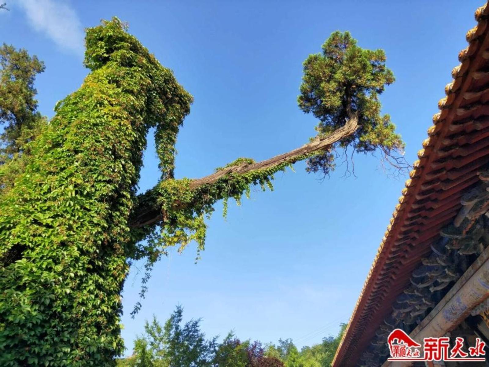 绕过天王殿,曲径通幽进入西院,便是南郭寺的主院。院内有一株高大葳蕤的古柏,根部由长方形青砖花墙围护,主干上分三叉,分别向南北横斜逸出。南向一枝黛色霜皮,干枯如柴,直插云霄,但顶端仍青春焕发,枝叶茂盛。西北方向一枝已枯,北向一枝巧妙地悬架于槐树枝杈上,更神奇的是已劈开的枯干中长着一株黑蛋树(朴树),与老树相依为命,据考中国仅此一树。这就是名扬千古,享誉秦州八景之一的“南山古柏”。