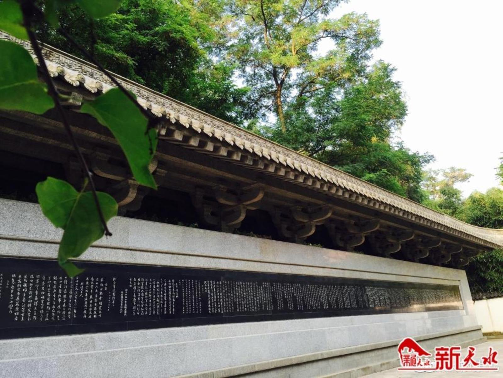 过北流泉,就到了新建的“二妙轩”诗碑廊,碑长30多米,高4米左右,青石铺面,因集名家王羲之、王献之等人的书法于一体,诗妙、字妙故称“二妙”。新建“二妙轩”碑廊时还刻制了近现代名人王宽、冯国瑞、霍松林的“二妙轩”跋记和重印的“二妙轩”贴序以及王锋、何绍基、于右任诸大家的秦州文墨宝。此轩典雅端庄,文化深厚浓郁,它让诗圣杜甫的《秦州杂诗》与书圣王羲之墨宝,堪称极品的双绝融合为一体,成为人们传承和景仰他们的胜地。