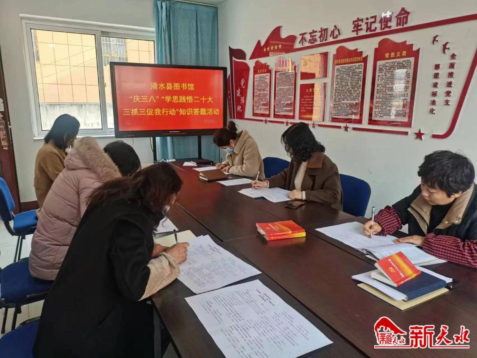 学思践悟二十大,三抓三促我行动。3月7日上午,清水县图书图开展“学思践悟二十大,三抓三促我行动”知识答题活动。此次竞赛内容包括习近平新时代中国特色社会主义思想,党的二十大精神、新修订党章、三抓三促行动等重要内容。通过答题,让女职工进一步深入学习宣传贯彻党的二十大精神,深化“三抓三促”行动,激励引导女干部以党的二十大精神为指引,在本职工作上踔厉奋发、勇毅前行、创新实干、再创佳绩。