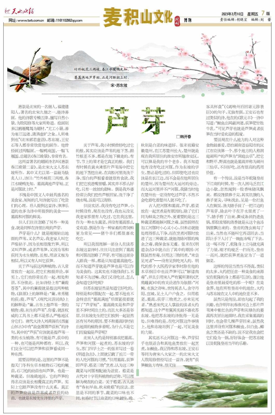 客共杯盘”(《离峡州后回寄元珍表臣》)的句子,无独有偶,王安石也有过类似的诗,他在的《歌元丰》一诗中写道:“鲥鱼出网蔽洲渚,荻笋肥甘胜牛乳。”可见芦芽也就是芦笋或者荻笋在当时受欢迎的程度。