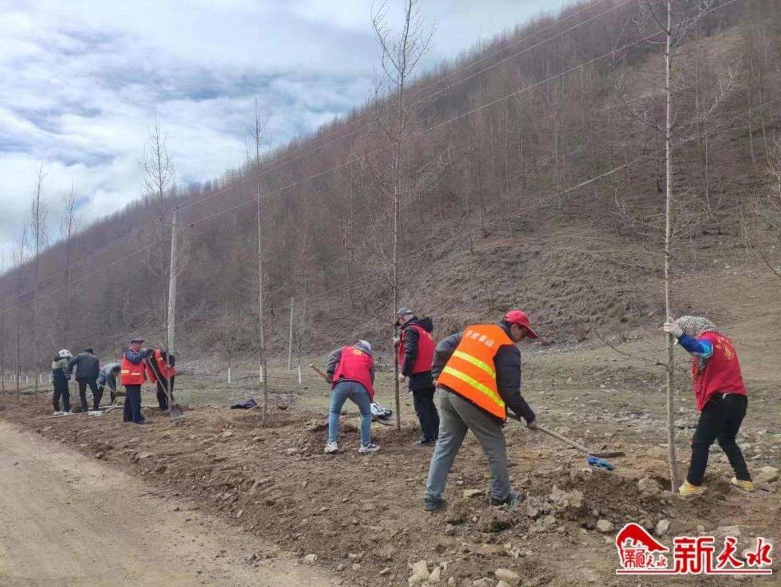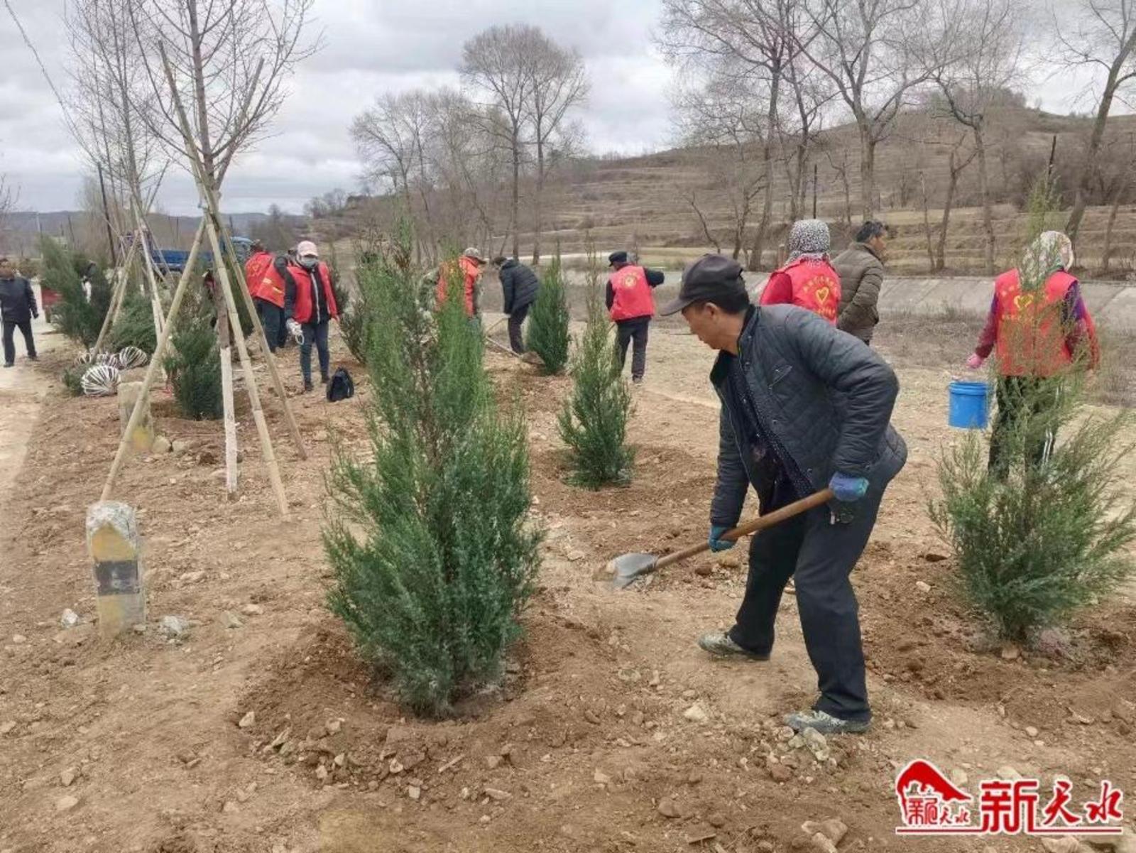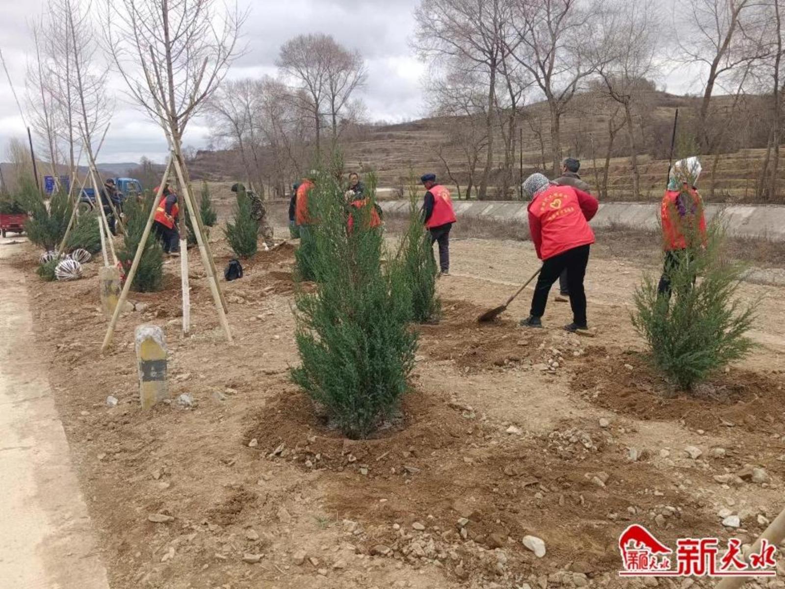 在杨家寺镇大庄草原沿线义务植树现场,漫山遍野到处都是红马甲的身影,只见大家一起挥锹铲土、培土围堰、提水浇灌……落叶松、刺柏、红叶李等,一棵棵树苗迎风而立,充满勃勃生机,为美丽的杨家寺再添一片新绿。