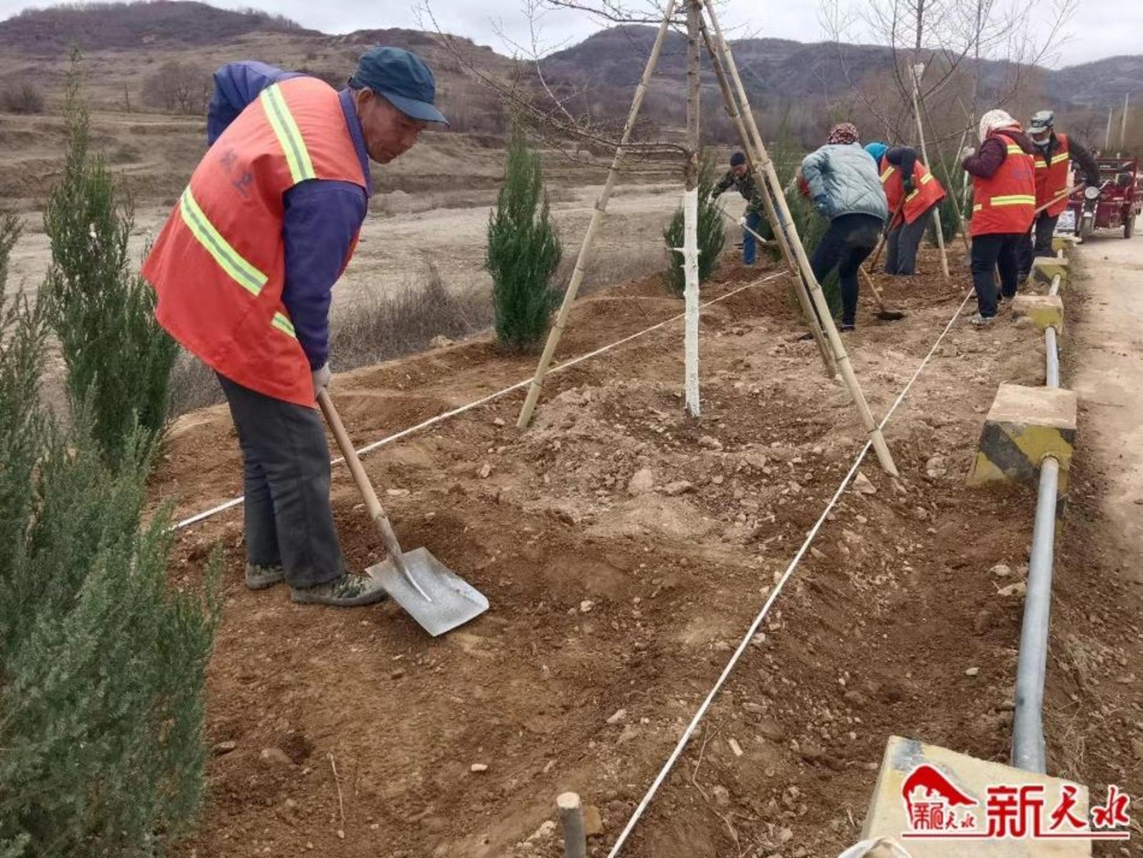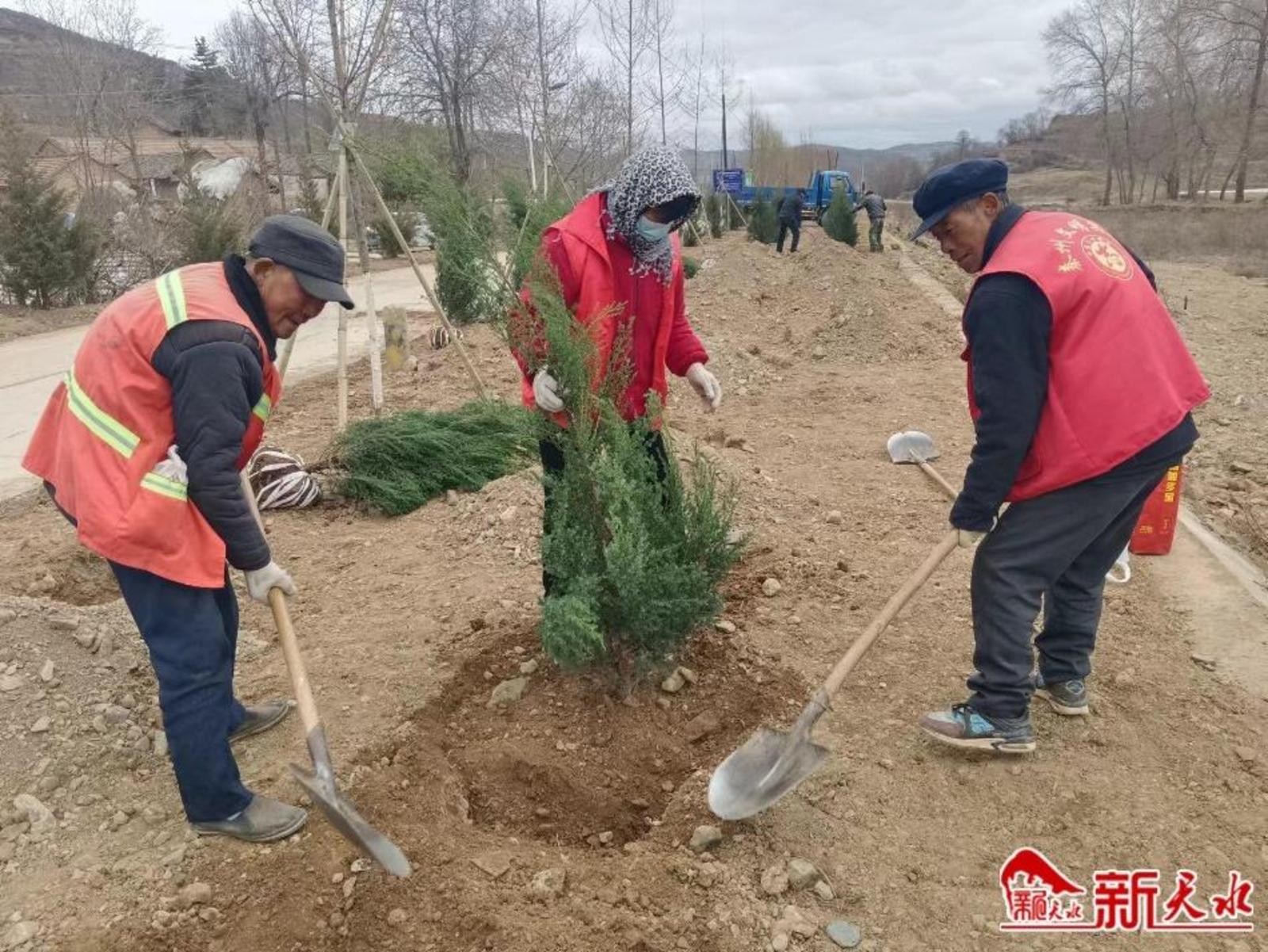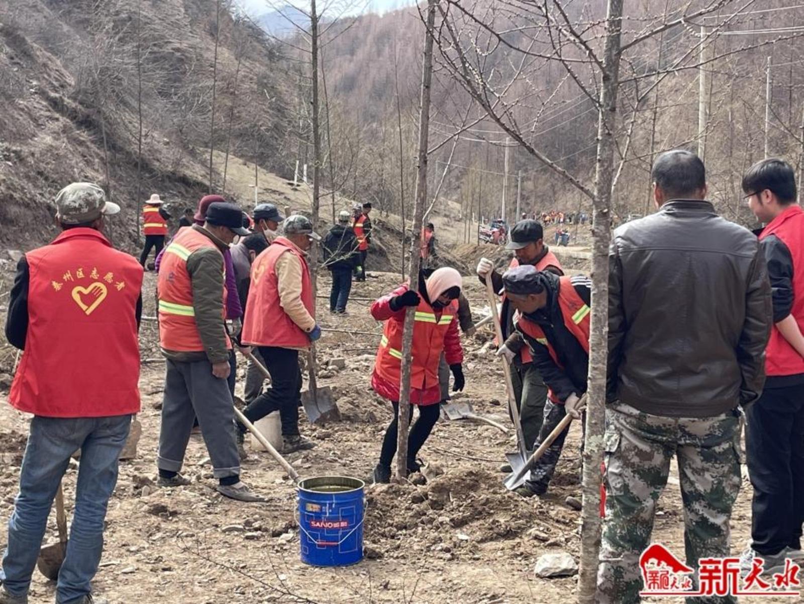在杨家寺镇大庄草原沿线义务植树现场,漫山遍野到处都是红马甲的身影,只见大家一起挥锹铲土、培土围堰、提水浇灌……落叶松、刺柏、红叶李等,一棵棵树苗迎风而立,充满勃勃生机,为美丽的杨家寺再添一片新绿。