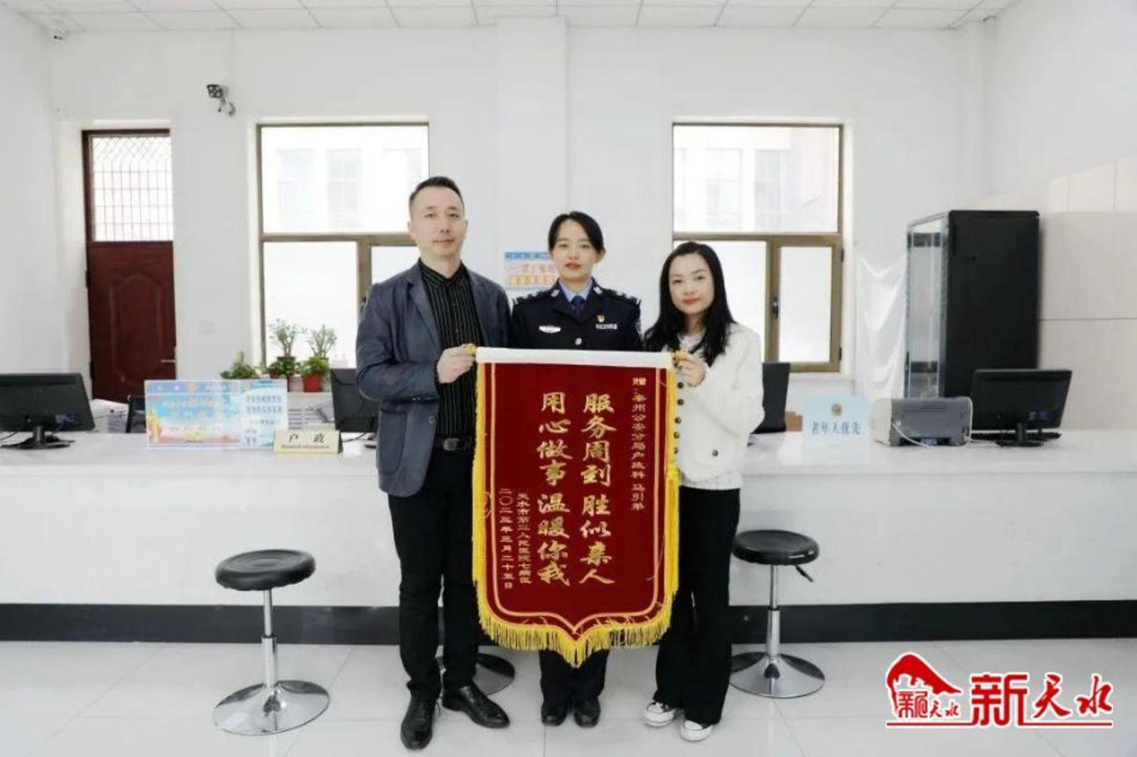 新天水讯【记者蔚军平】3月30日,天水市第三人民医院工作人员将写有“服务周到,胜似亲人”“用心做事,温暖你我”的两面锦旗分别递到秦州公安分局户政科和天水郡派出所民警手中,对秦州公安户籍民警热情、高效、便捷、暖心的服务表示衷心的感谢。